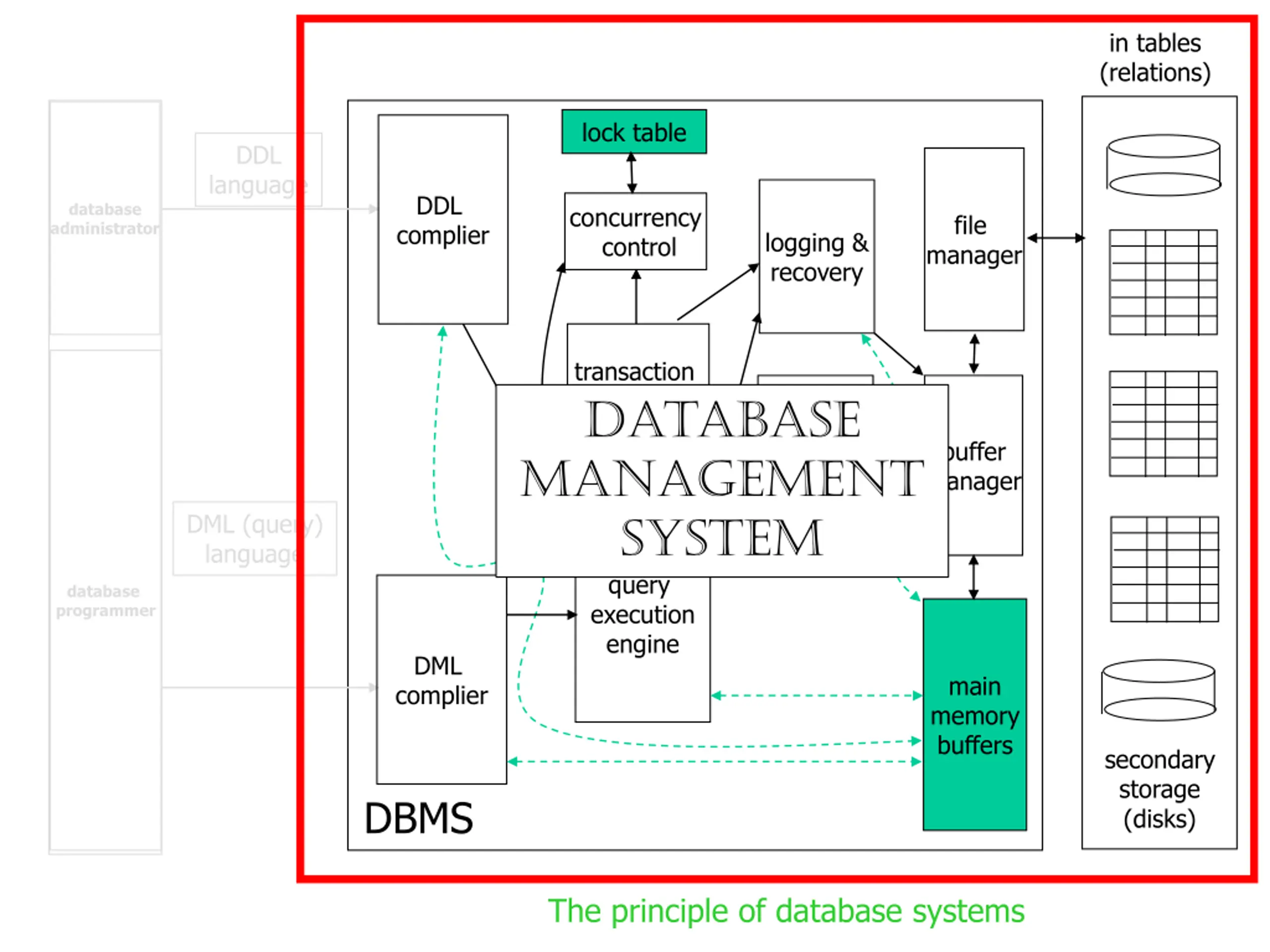 in tables (relations) lock table DDL language DDL complier database administrator concurrency control file logging & recovery manager transaction manager Database Management System index/file manager buffer manager DML (query) language query execution engine database programmer DML complier main memory buffers secondary storage (disks) DBMS The principle of database systems