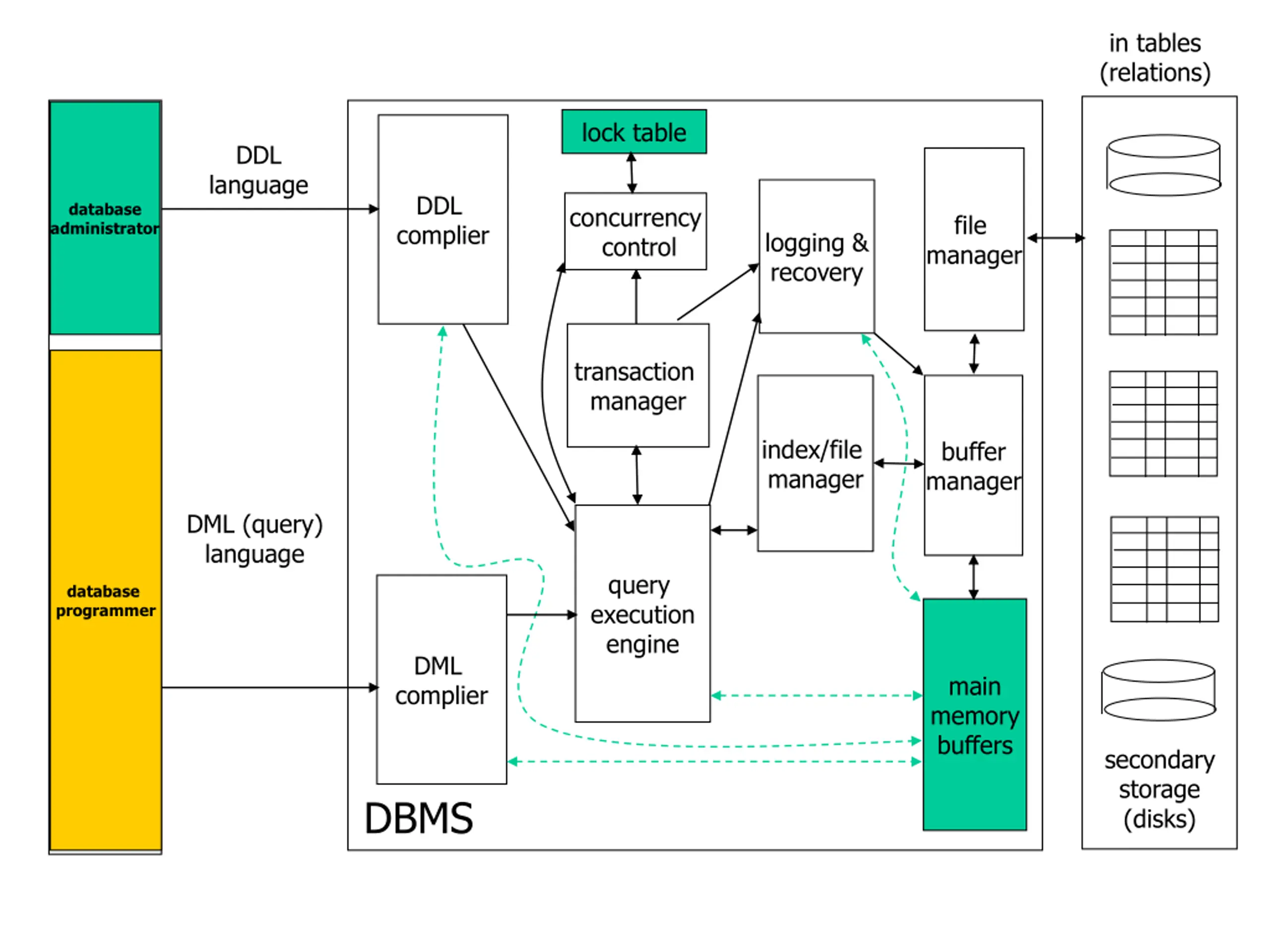 in tables (relations) lock table DDL language DDL complier database administrator concurrency control file logging & recovery manager transaction manager index/file manager buffer manager DML (query) language query execution engine database programmer DML complier main memory buffers secondary storage (disks) DBMS