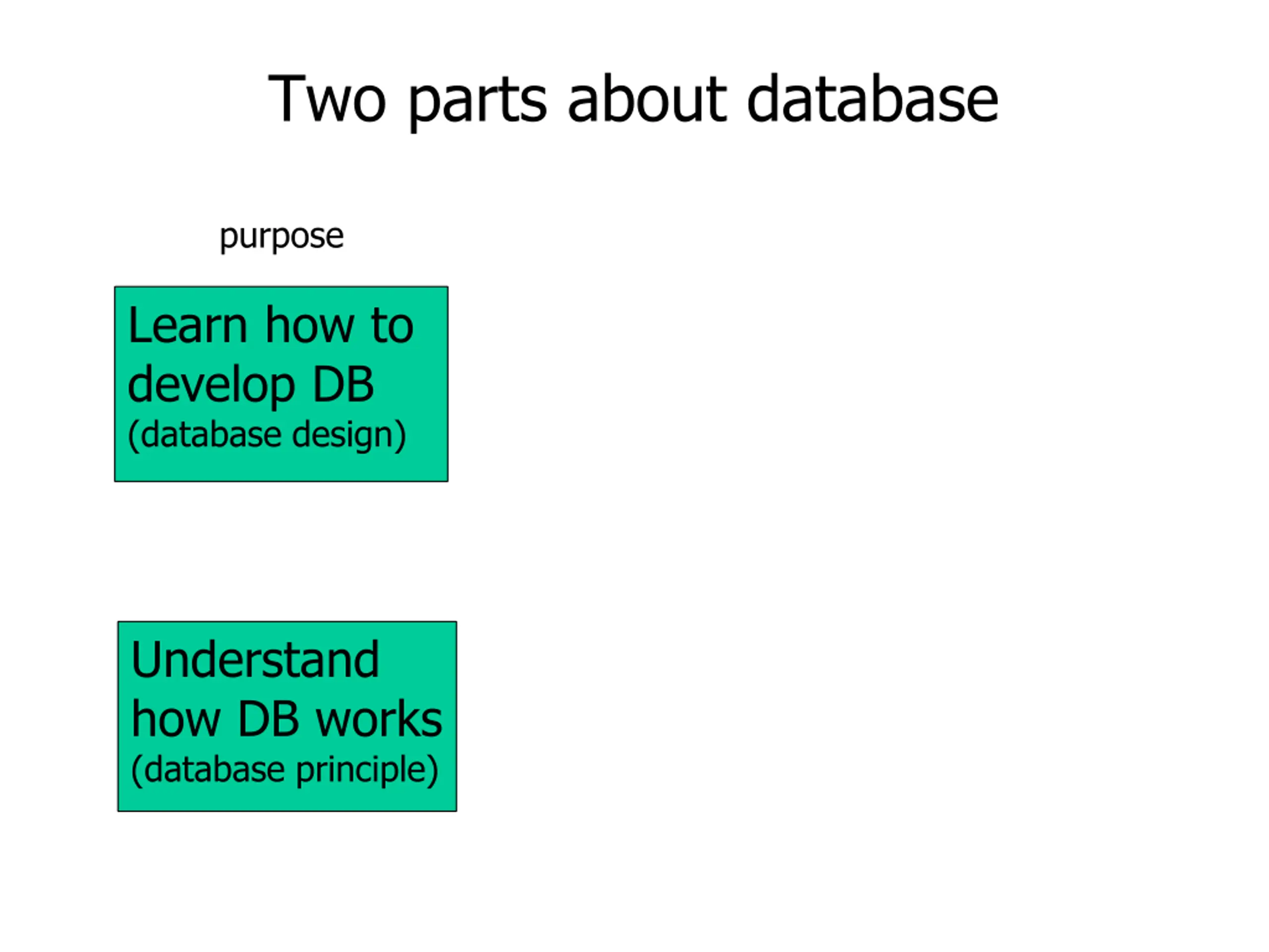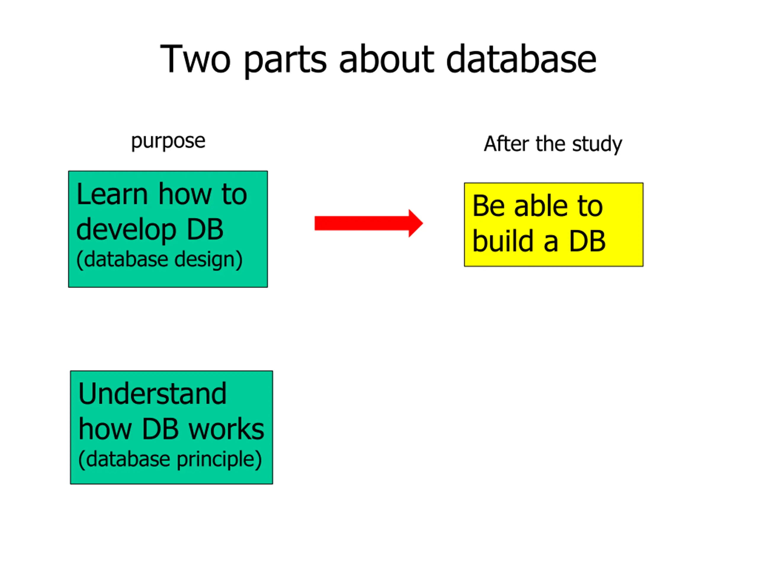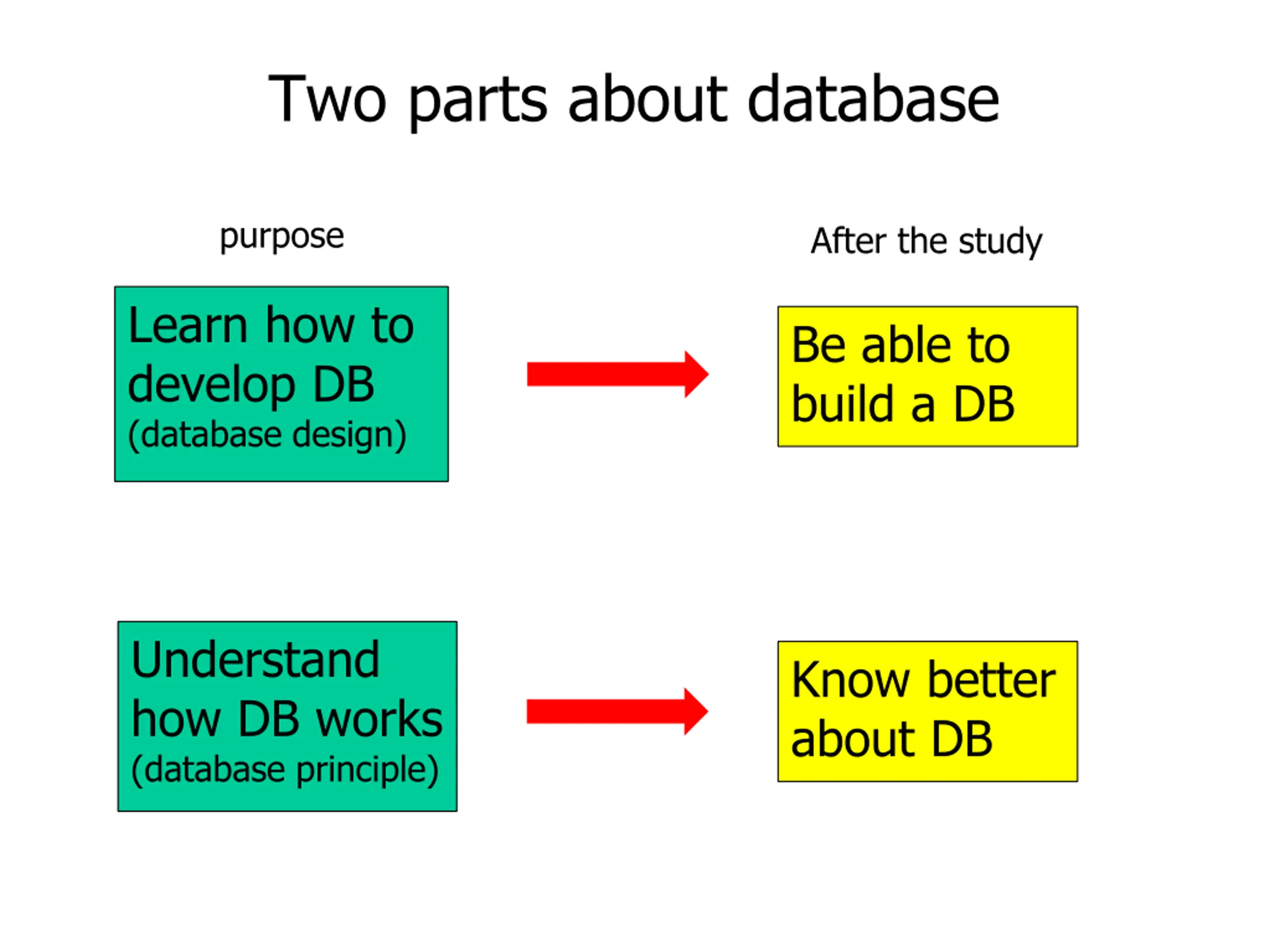 Two parts about database purpose After the study Learn how to develop DB (database design) Be able to build a DB Help develop better DB necessary Understand how DB works (database principle) Know better about DB