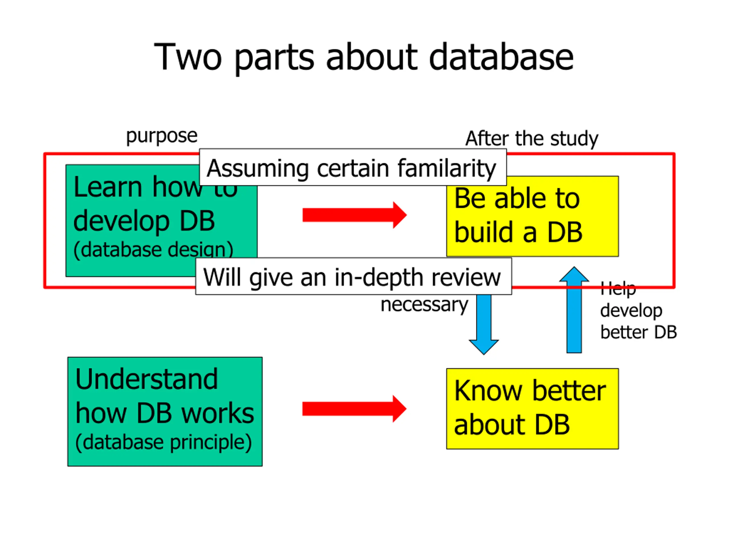 Two parts about database purpose After the study Assuming certain familarity Learn how to develop DB (database design) Be able to build a DB Will give an in-depth review Help develop better DB necessary Understand how DB works (database principle) Know better about DB
