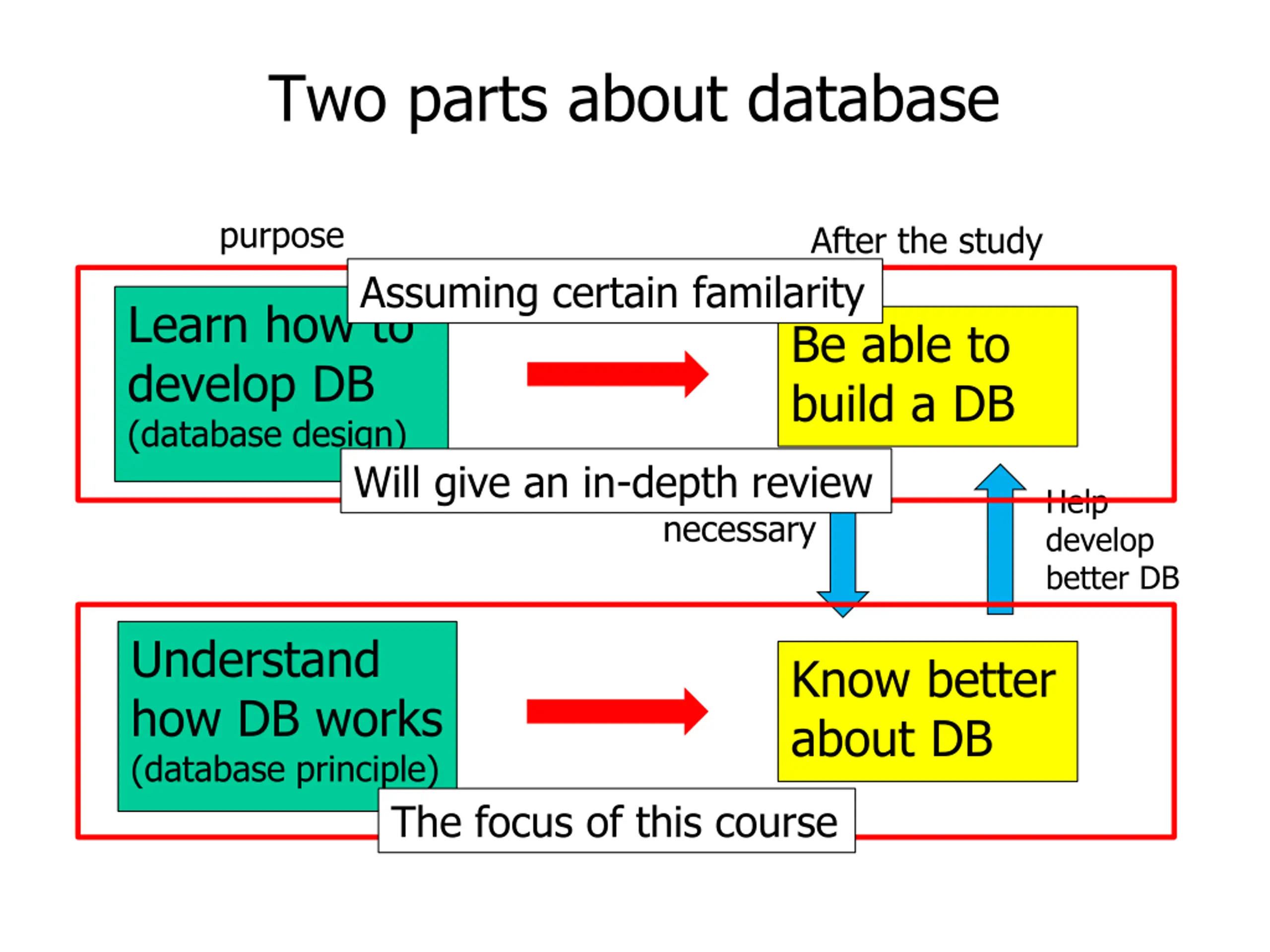 Two parts about database purpose After the study Assuming certain familarity Learn how to develop DB (database design) Be able to build a DB Will give an in-depth review Help develop better DB necessary Understand how DB works (database principle) Know better about DB The focus of this course