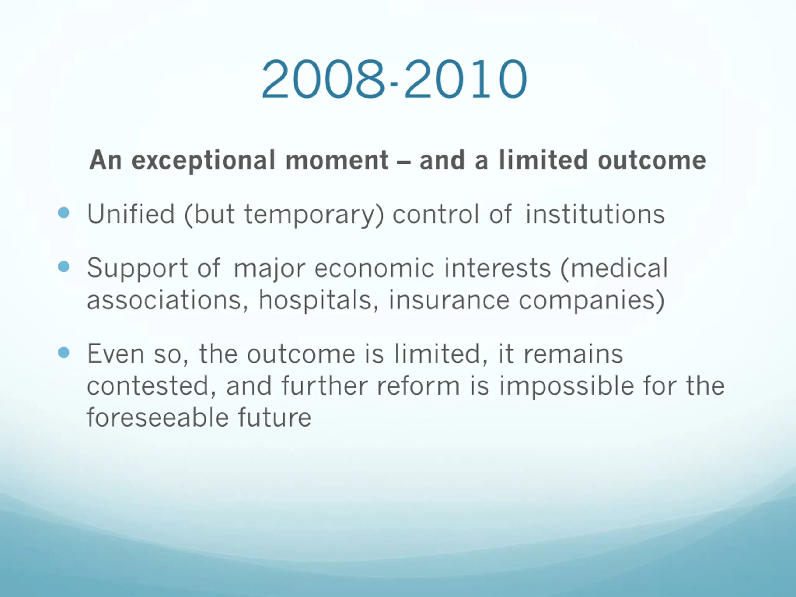 2008-2010 An exceptional moment and a limited outcome Unified (but temporary) control of institutions Support of major economic interests (medical associations, hospitals, insurance companies) Even so, the outcome is limited, it remains contested, and further reform is impossible for the foreseeable future
