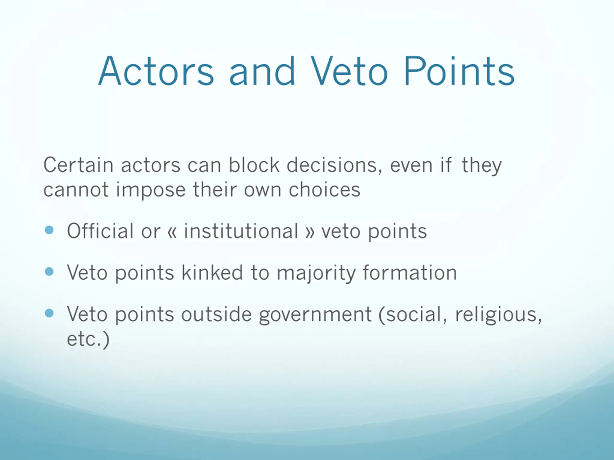 Actors and Veto Points Certain actors can block decisions, even if they cannot impose their own choices Official or institutional veto points Veto points kinked to majority formation Veto points outside government (social, religious, etc.)