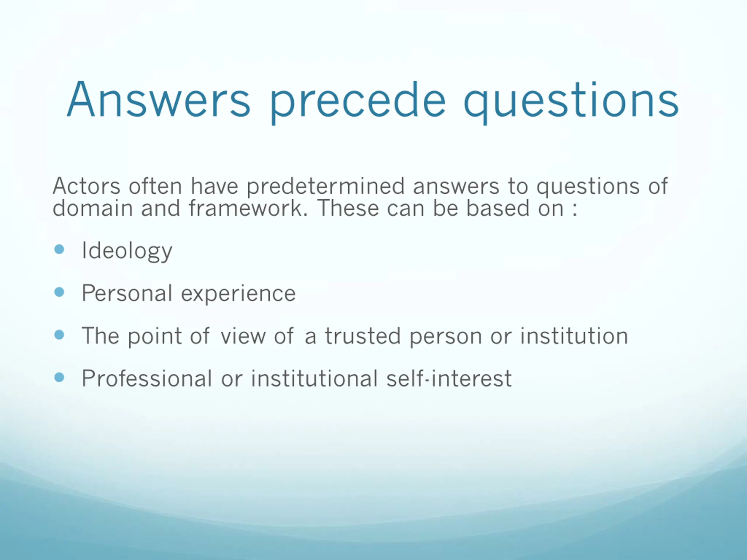 Answers precede questions Actors often have predetermined answers to questions of domain and framework. These can be based on : Ideology Personal experience The point of view of a trusted person or institution Professional or institutional self-interest