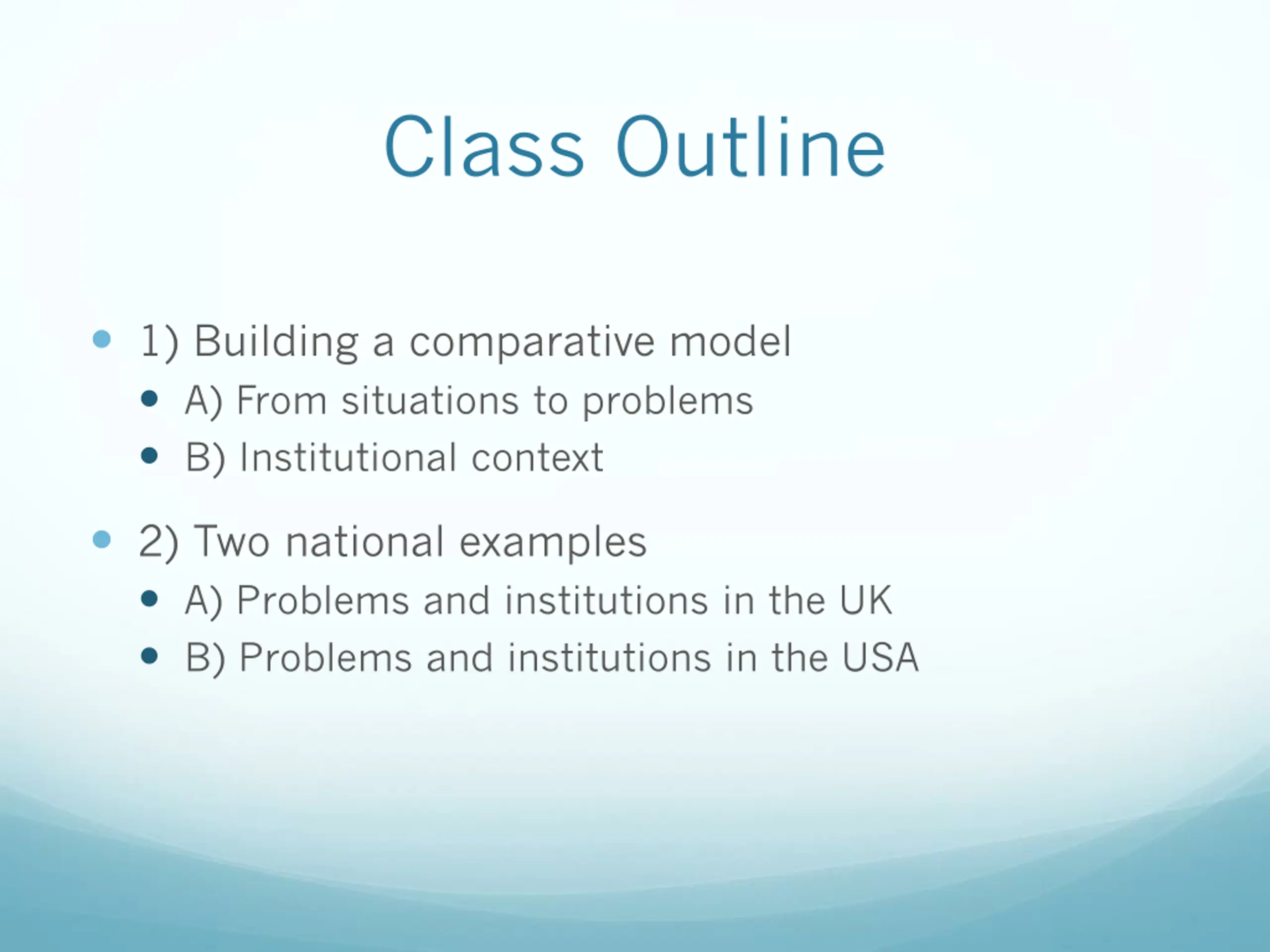 Class Outline 1) Building a comparative model A) From situations to problems B) Institutional context 2) Two national examples A) Problems and institutions in the UK B) Problems and institutions in the USA