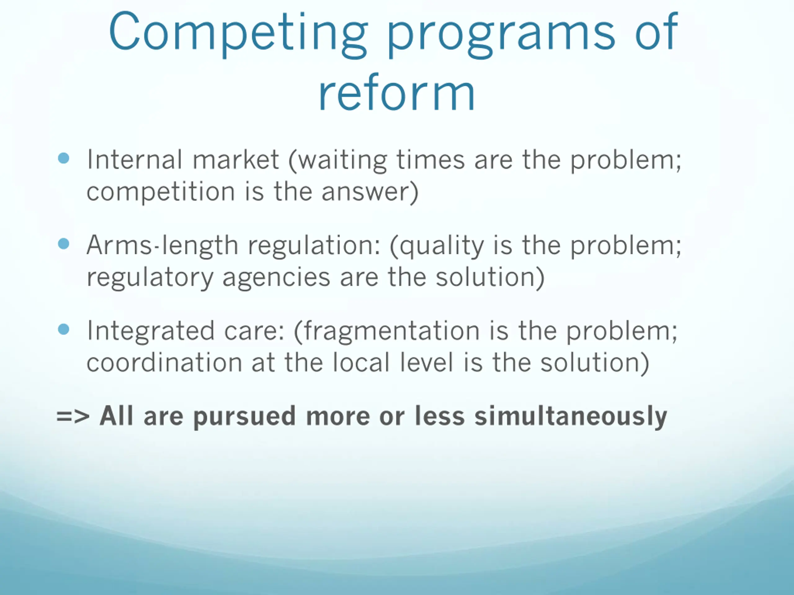 Competing programs of reform Internal market (waiting times are the problem; competition is the answer) Arms-length regulation: (quality is the problem; regulatory agencies are the solution) Integrated care: (fragmentation is the problem; coordination at the local level is the solution) => All are pursued more or less simultaneously