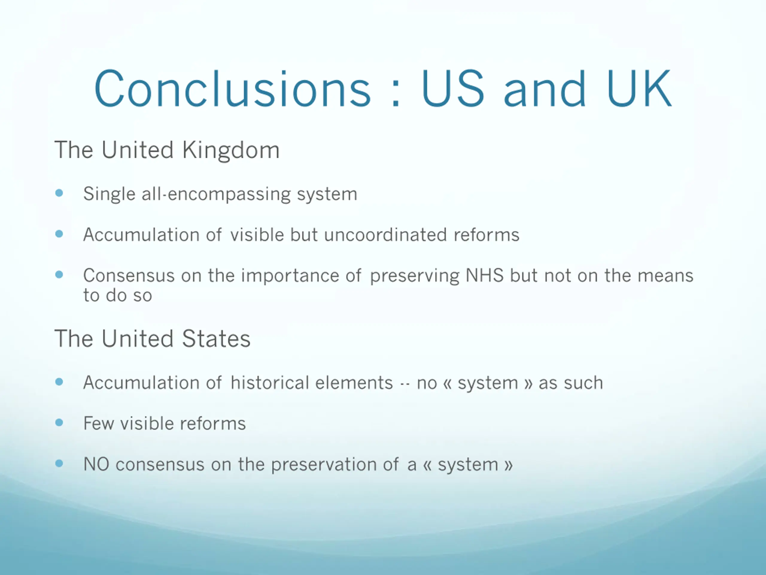 Conclusions : US and UK The United Kingdom Single all-encompassing system Accumulation of visible but uncoordinated reforms Consensus on the importance of preserving NHS but not on the means to do so The United States Accumulation of historical elements -- no system as such Few visible reforms NO consensus on the preservation of a system