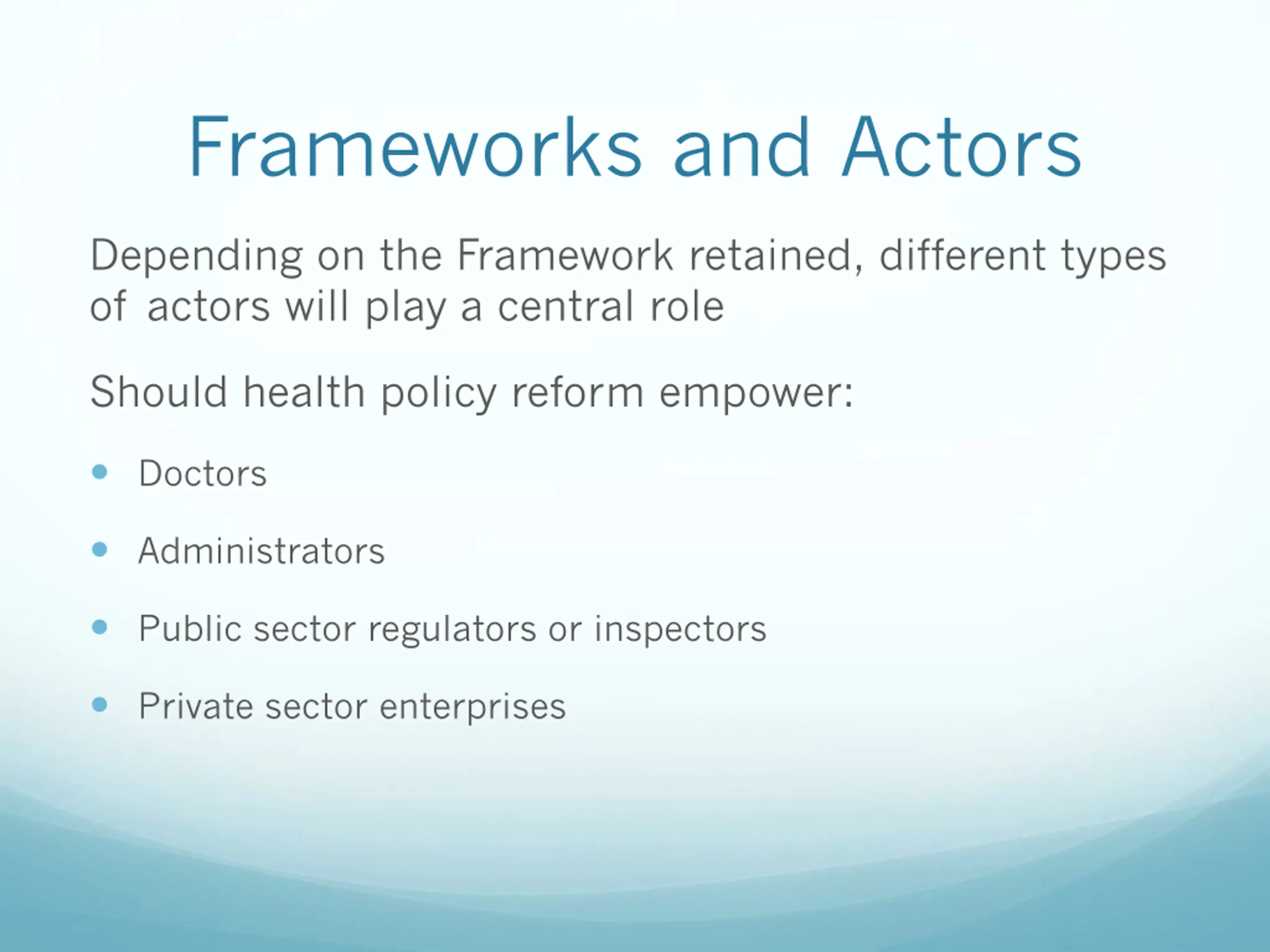 Frameworks and Actors Depending on the Framework retained, different types of actors will play a central role Should health policy reform empower: Doctors Administrators Public sector regulators or inspectors Private sector enterprises