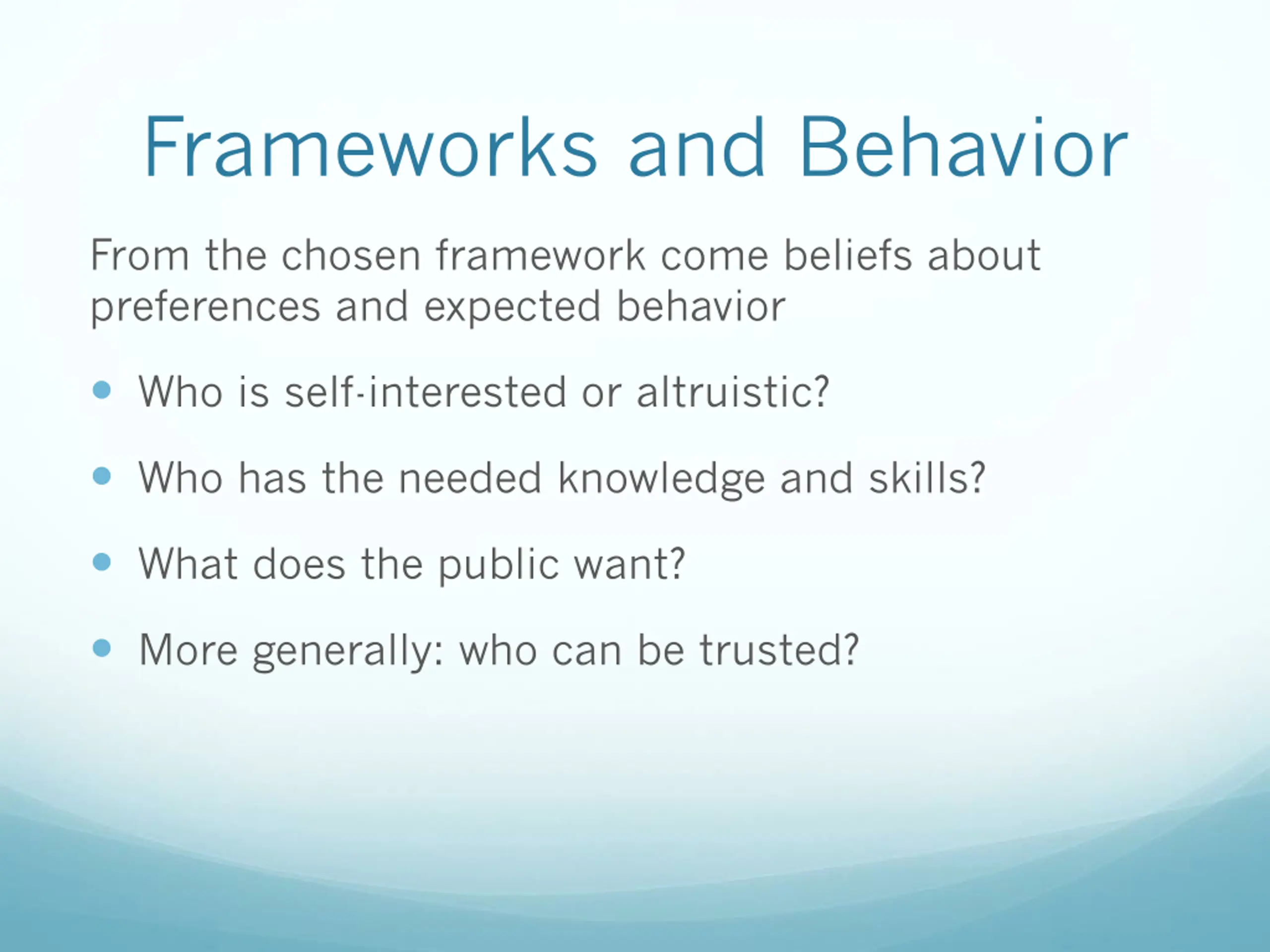 Frameworks and Behavior From the chosen framework come beliefs about preferences and expected behavior Who is self-interested or altruistic? Who has the needed knowledge and skills? What does the public want? More generally: who can be trusted?