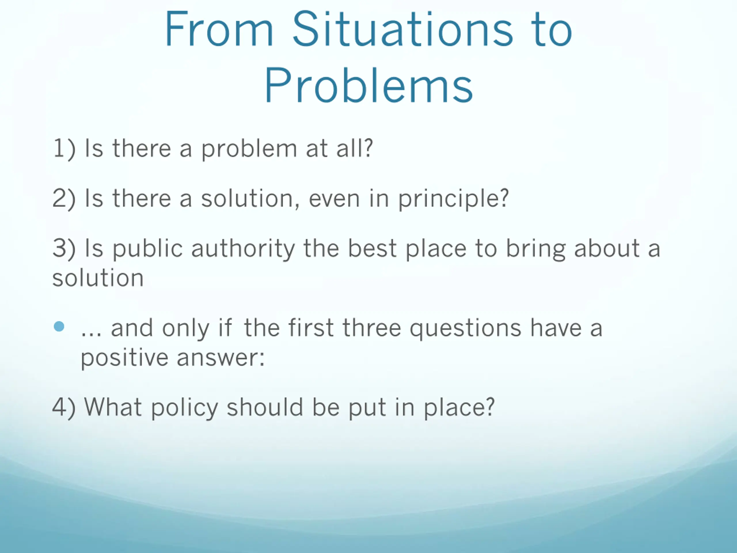 From Situations to Problems 1) Is there a problem at all? 2) Is there a solution, even in principle? 3) Is public authority the best place to bring about a solution and only if the first three questions have a positive answer: 4) What policy should be put in place?
