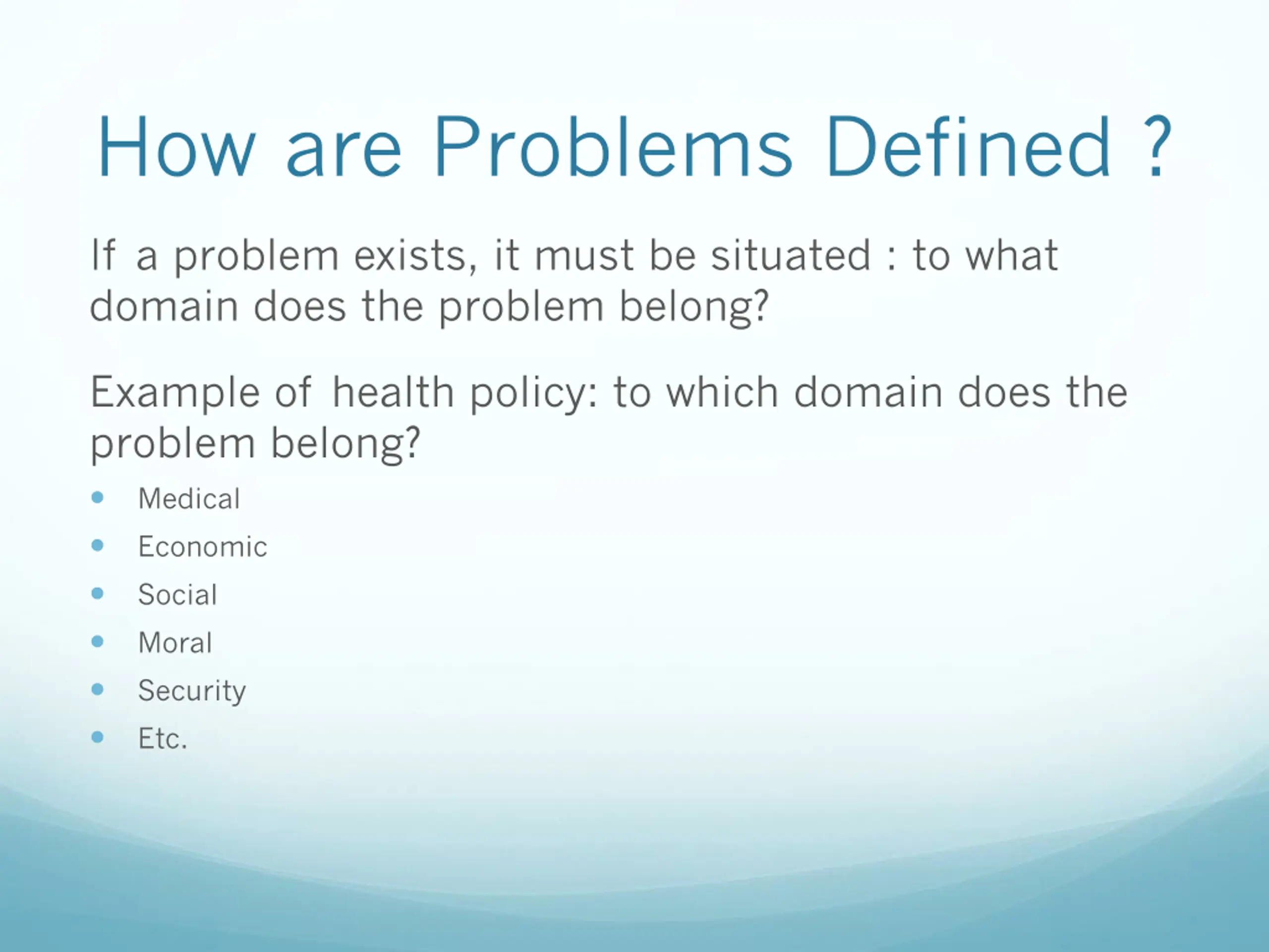 How are Problems Defined ? If a problem exists, it must be situated : to what domain does the problem belong? Example of health policy: to which domain does the problem belong? Medical Economic Social Moral Security Etc.