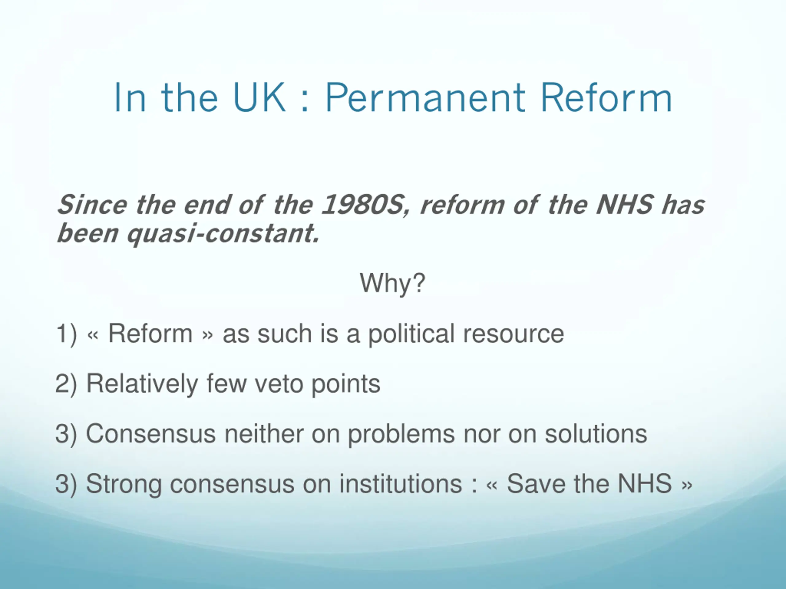 In the UK : Permanent Reform Since the end of the 1980S, reform of the NHS has been quasi-constant. Why? 1) Reform as such is a political resource 2) Relatively few veto points 3) Consensus neither on problems nor on solutions 3) Strong consensus on institutions : Save the NHS