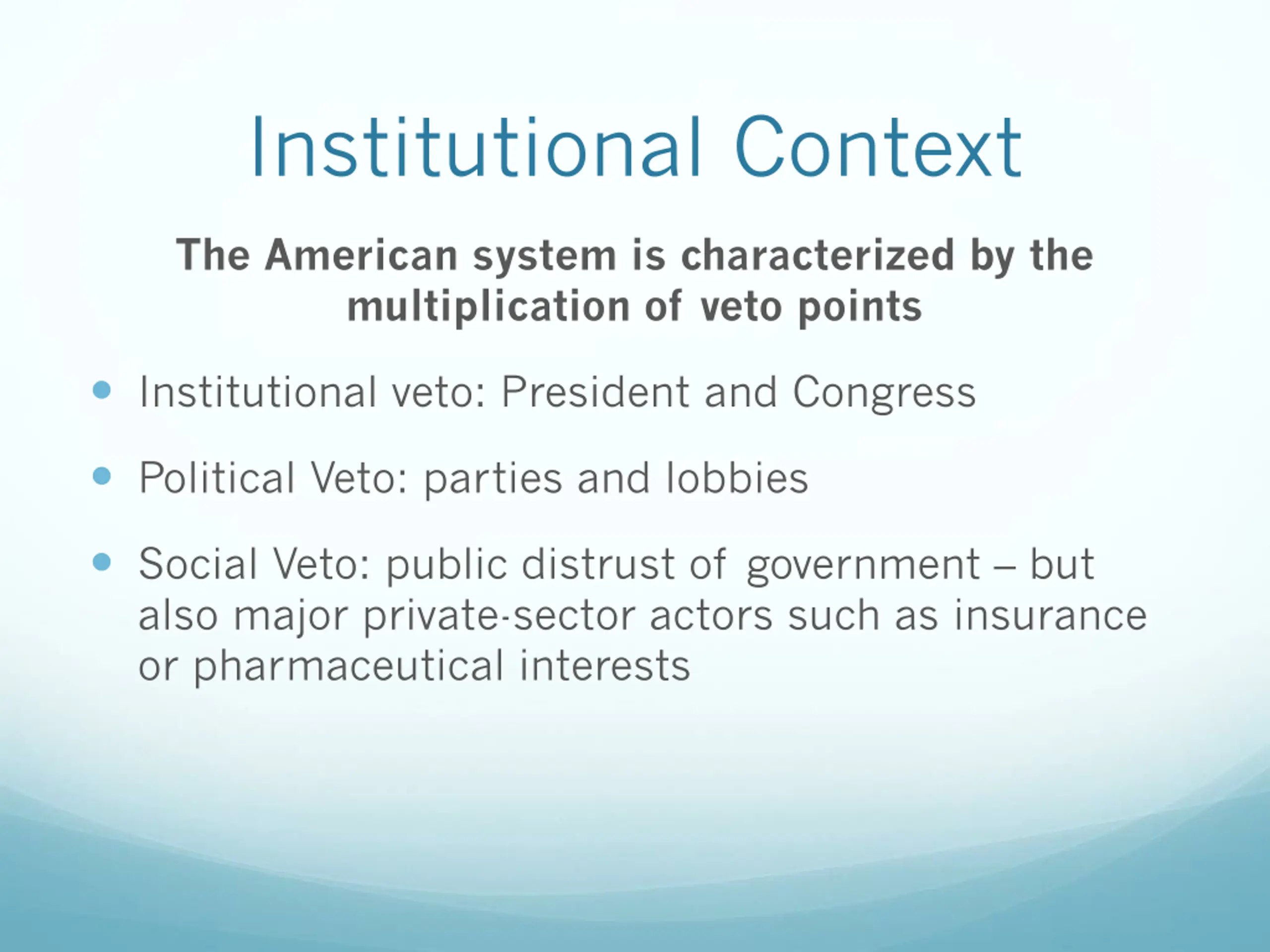 Institutional Context The American system is characterized by the multiplication of veto points Institutional veto: President and Congress Political Veto: parties and lobbies Social Veto: public distrust of government but also major private-sector actors such as insurance or pharmaceutical interests
