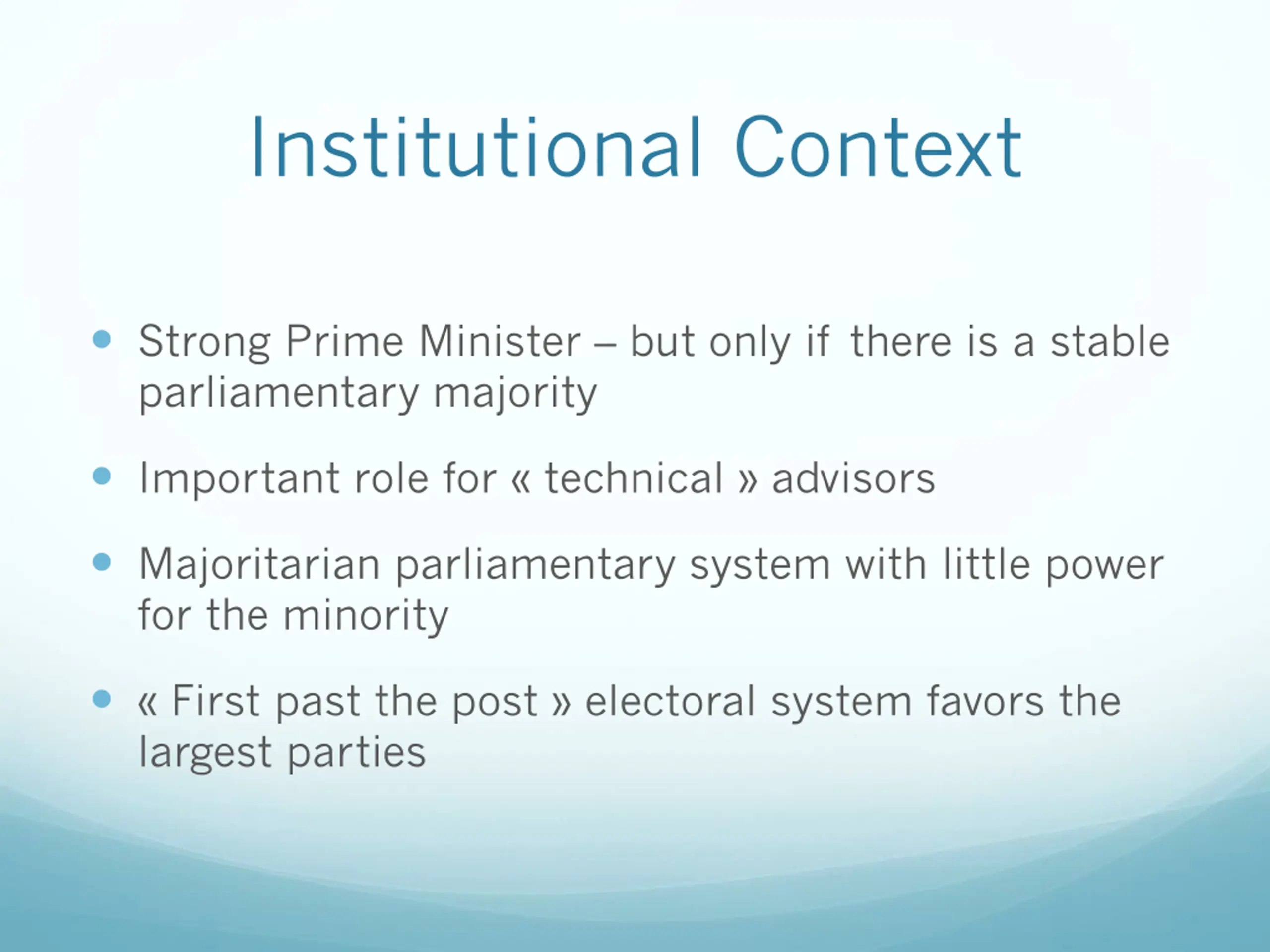 Institutional Context Strong Prime Minister but only if there is a stable parliamentary majority Important role for technical advisors Majoritarian parliamentary system with little power for the minority First past the post electoral system favors the largest parties