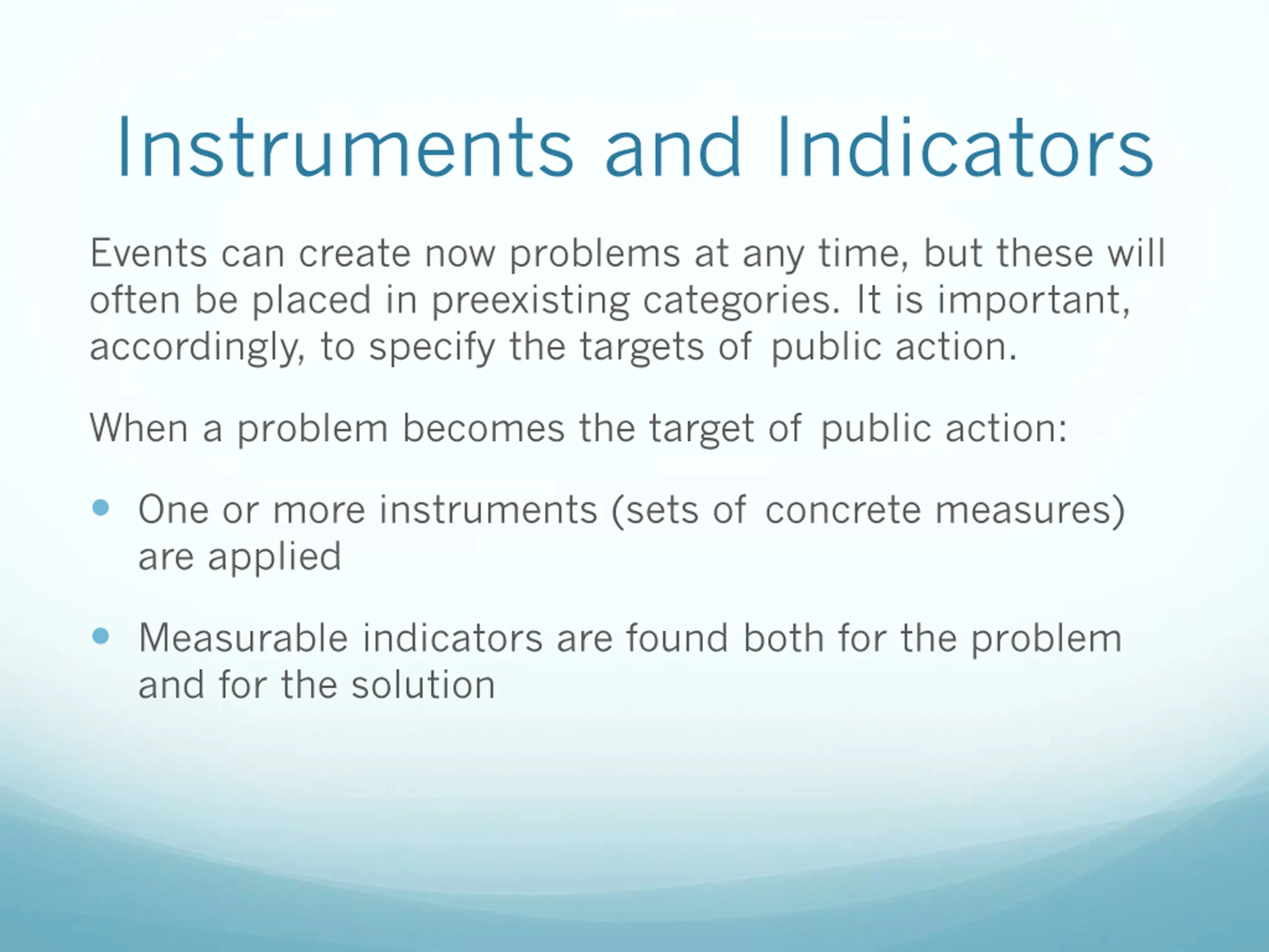Instruments and Indicators Events can create now problems at any time, but these will often be placed in preexisting categories. It is important, accordingly, to specify the targets of public action. When a problem becomes the target of public action: One or more instruments (sets of concrete measures) are applied Measurable indicators are found both for the problem and for the solution