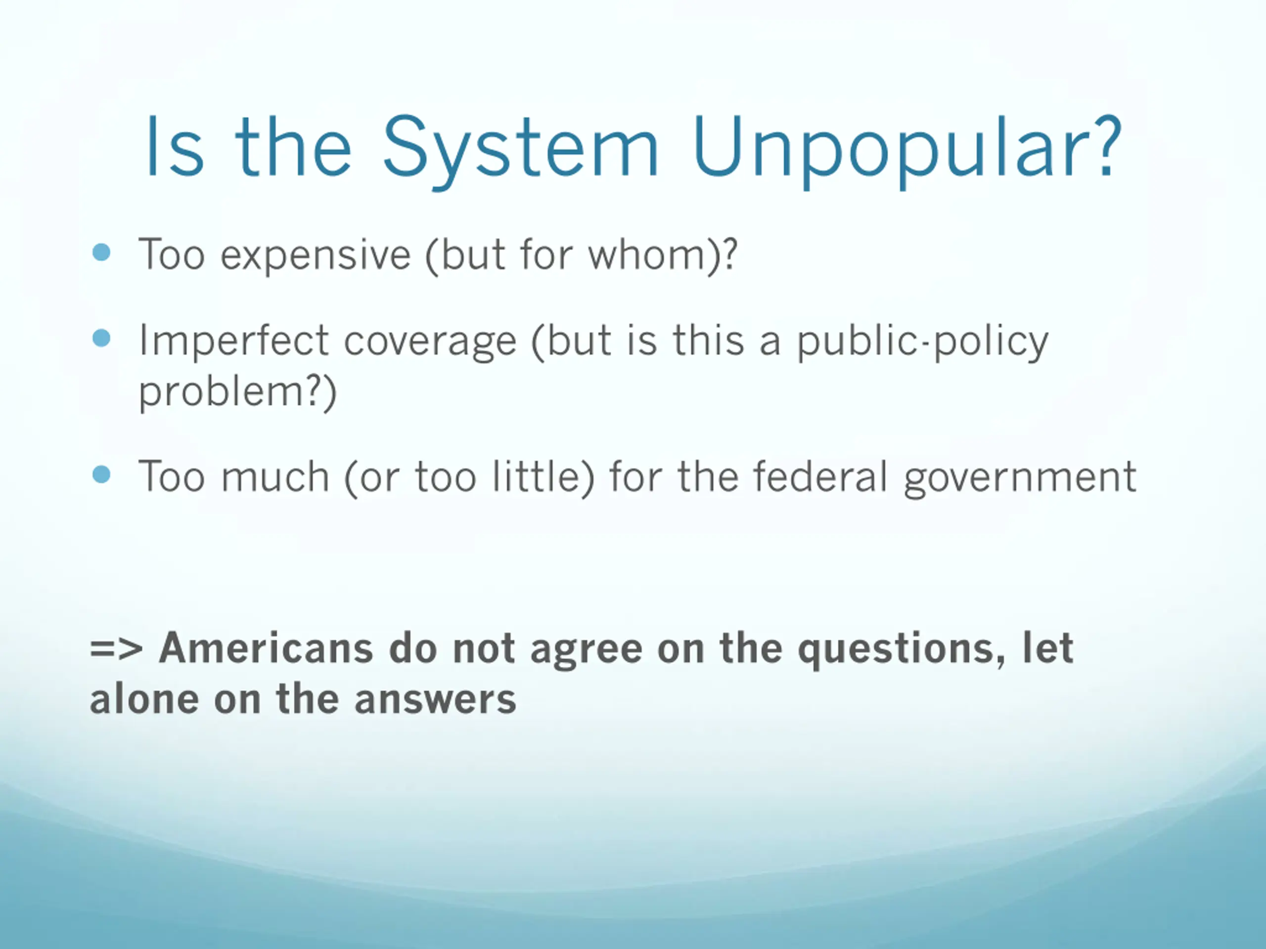 Is the System Unpopular? Too expensive (but for whom)? Imperfect coverage (but is this a public-policy problem?) Too much (or too little) for the federal government => Americans do not agree on the questions, let alone on the answers