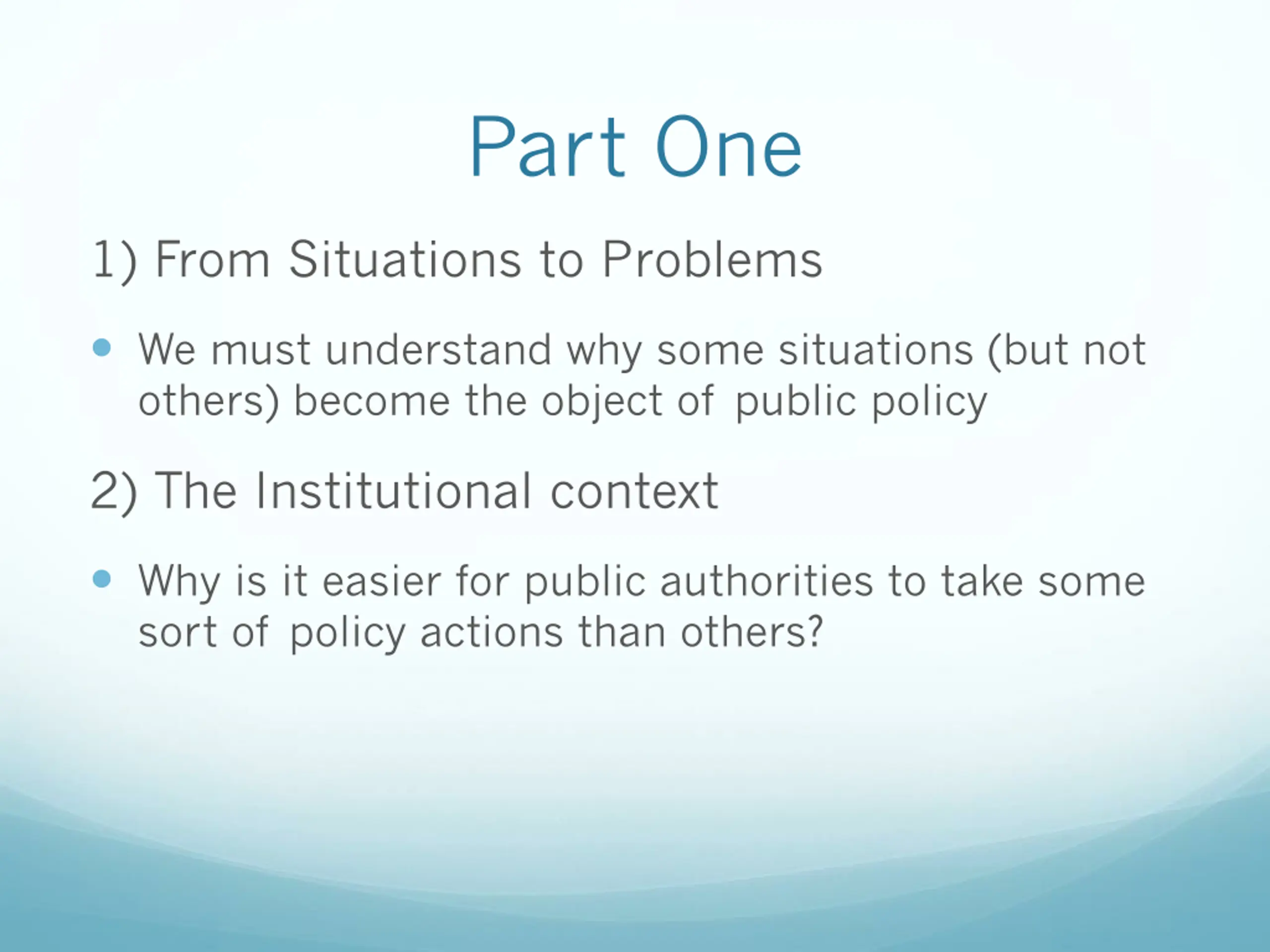 Part One 1) From Situations to Problems We must understand why some situations (but not others) become the object of public policy 2) The Institutional context Why is it easier for public authorities to take some sort of policy actions than others?