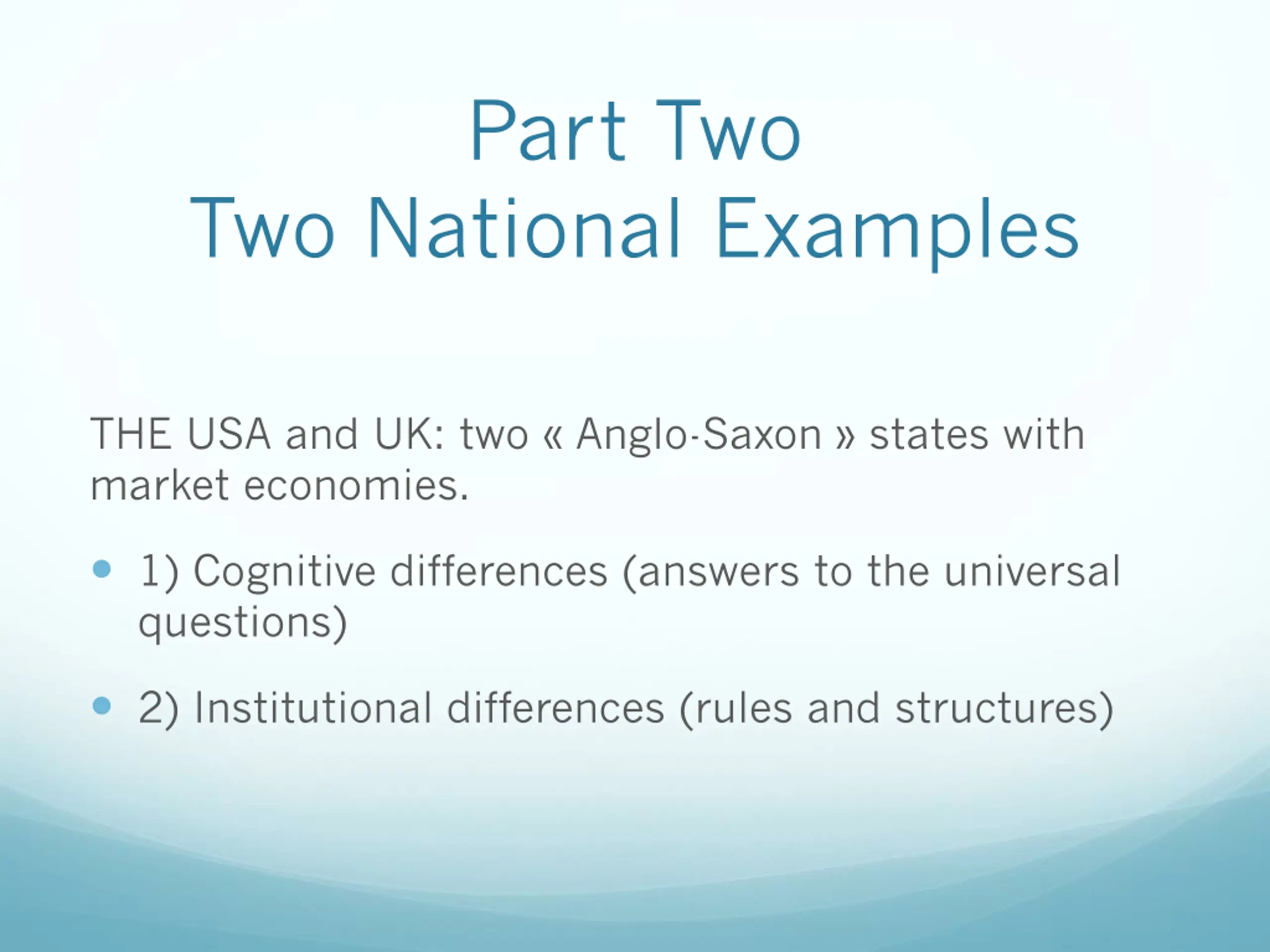 Part Two Two National Examples THE USA and UK: two Anglo-Saxon states with market economies. 1) Cognitive differences (answers to the universal questions) 2) Institutional differences (rules and structures)