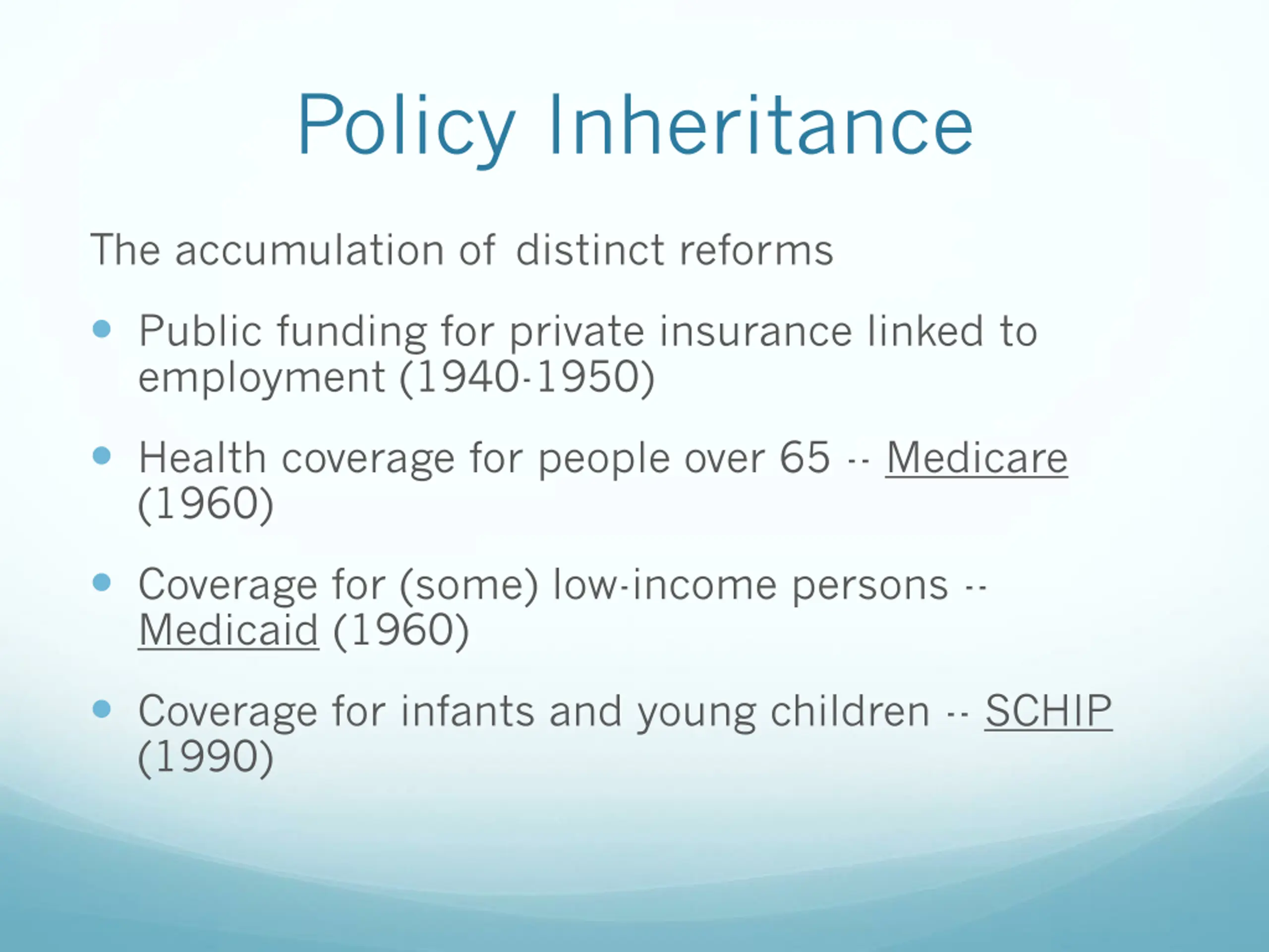 Policy Inheritance The accumulation of distinct reforms Public funding for private insurance linked to employment (1940-1950) Health coverage for people over 65 -- Medicare (1960) Coverage for (some) low-income persons -- Medicaid (1960) Coverage for infants and young children -- SCHIP (1990)
