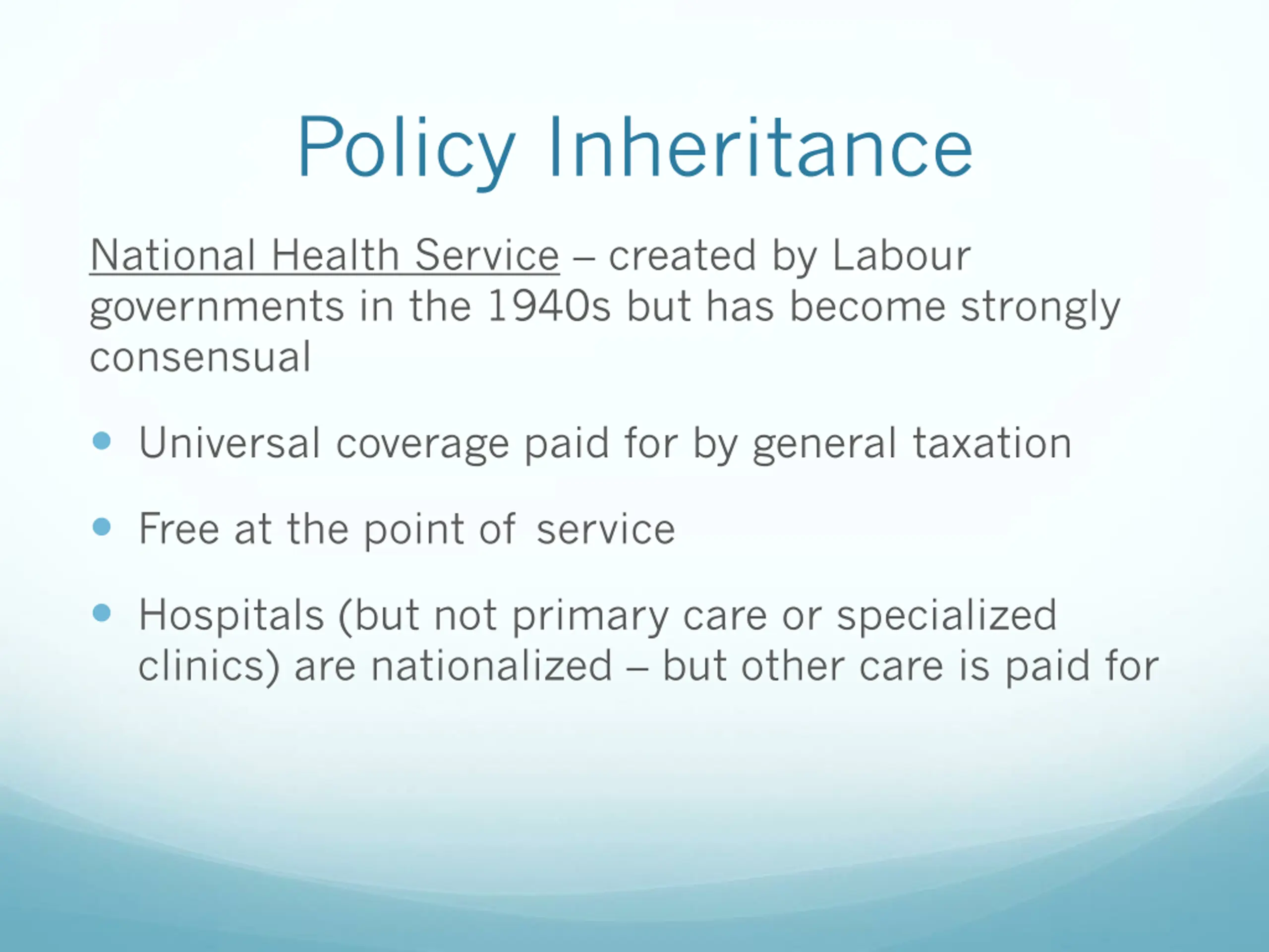 Policy Inheritance National Health Service created by Labour governments in the 1940s but has become strongly consensual Universal coverage paid for by general taxation Free at the point of service Hospitals (but not primary care or specialized clinics) are nationalized but other care is paid for