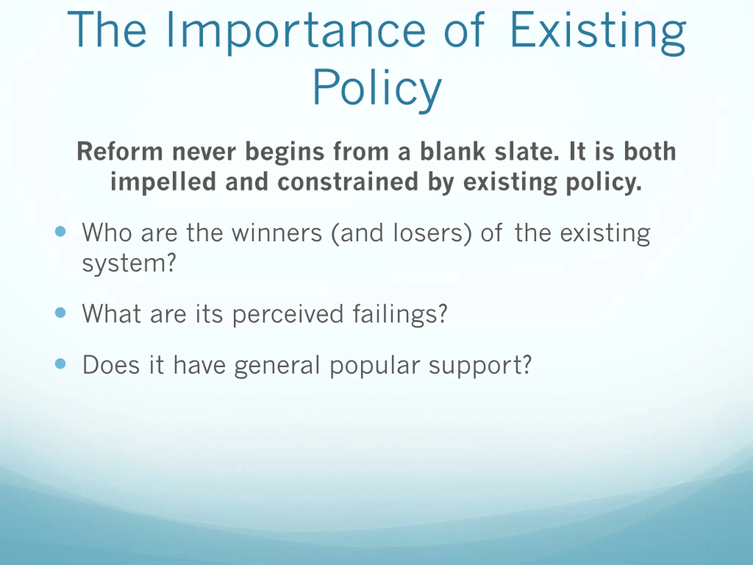 The Importance of Existing Policy Reform never begins from a blank slate. It is both impelled and constrained by existing policy. Who are the winners (and losers) of the existing system? What are its perceived failings? Does it have general popular support?