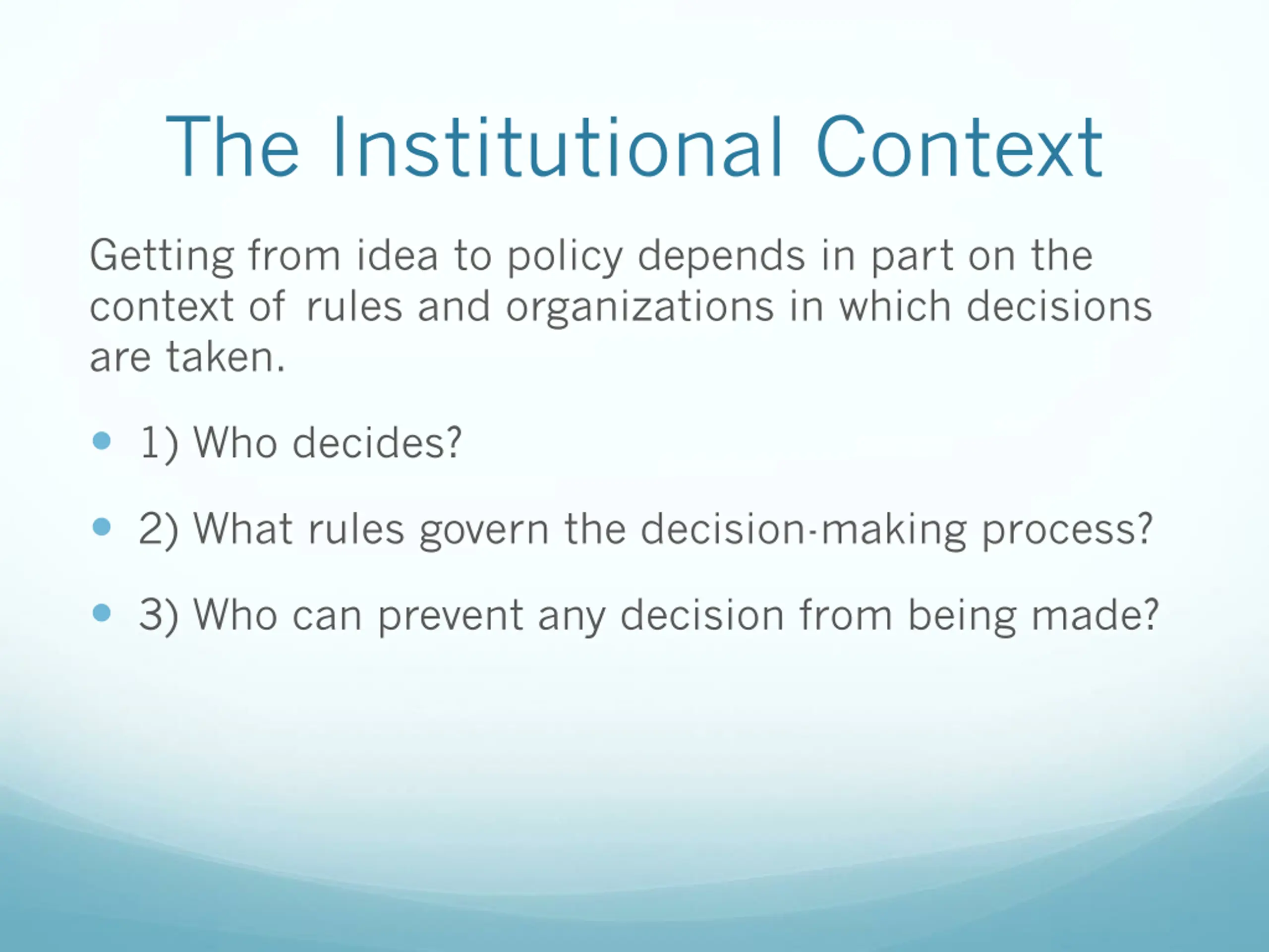 The Institutional Context Getting from idea to policy depends in part on the context of rules and organizations in which decisions are taken. 1) Who decides? 2) What rules govern the decision-making process? 3) Who can prevent any decision from being made?