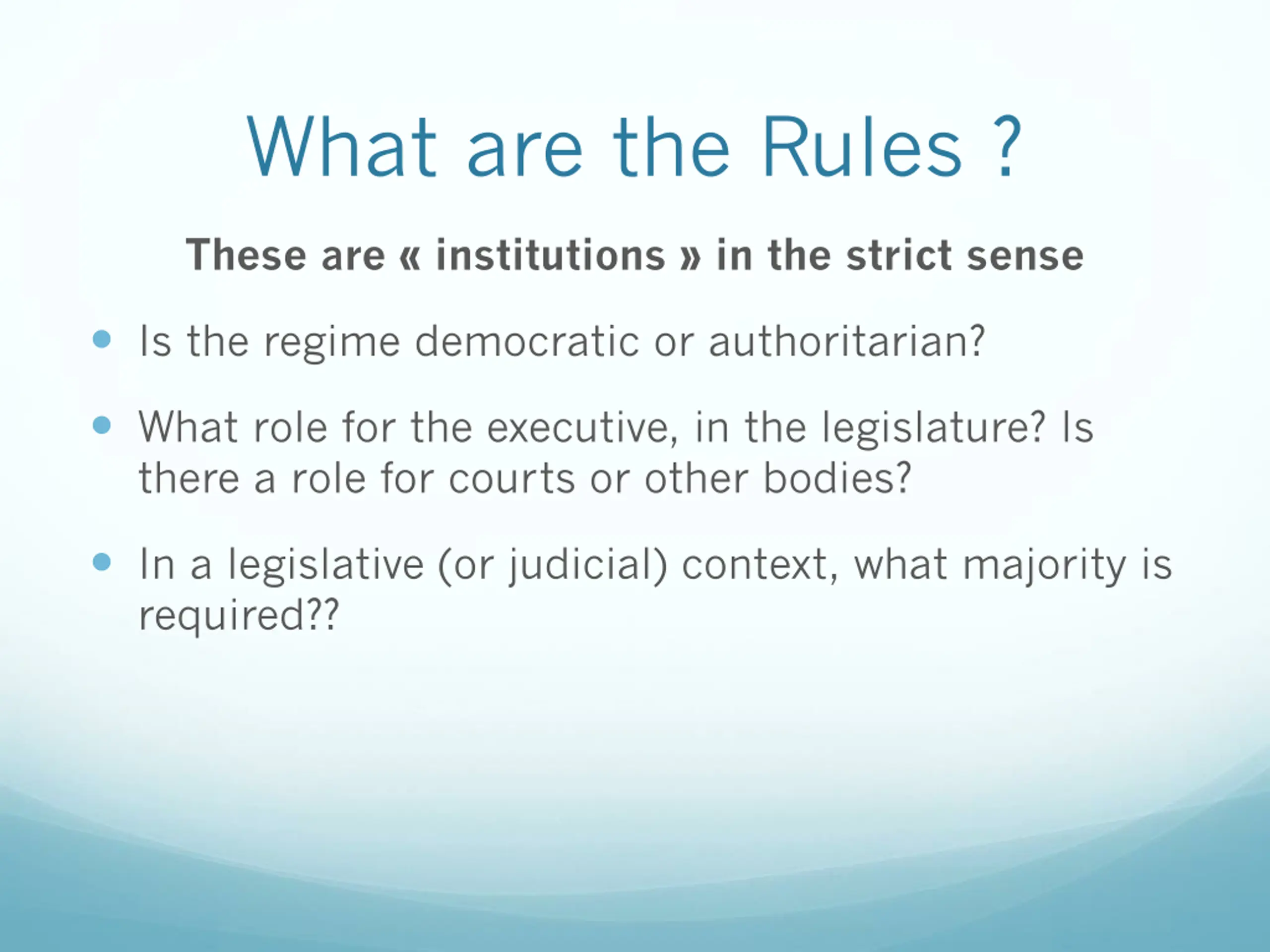 What are the Rules ? These are institutions in the strict sense Is the regime democratic or authoritarian? What role for the executive, in the legislature? Is there a role for courts or other bodies? In a legislative (or judicial) context, what majority is required??