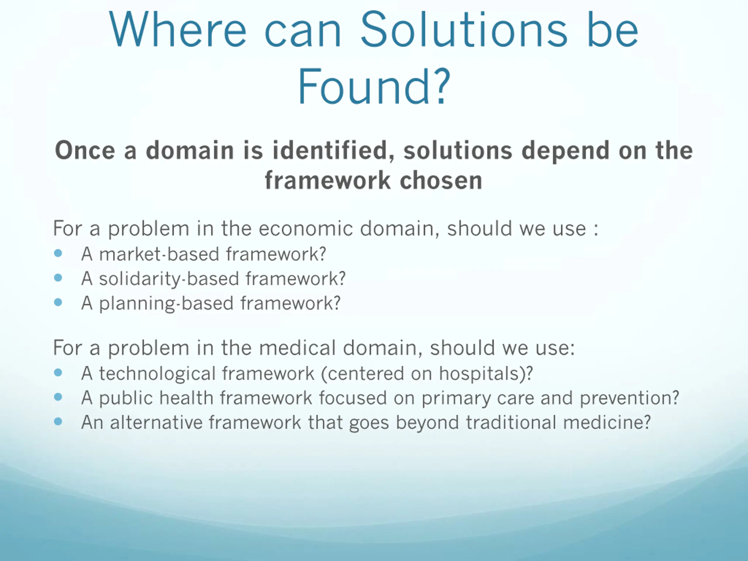 Where can Solutions be Found? Once a domain is identified, solutions depend on the framework chosen For a problem in the economic domain, should we use : A market-based framework? A solidarity-based framework? A planning-based framework? For a problem in the medical domain, should we use: A technological framework (centered on hospitals)? A public health framework focused on primary care and prevention? An alternative framework that goes beyond traditional medicine?