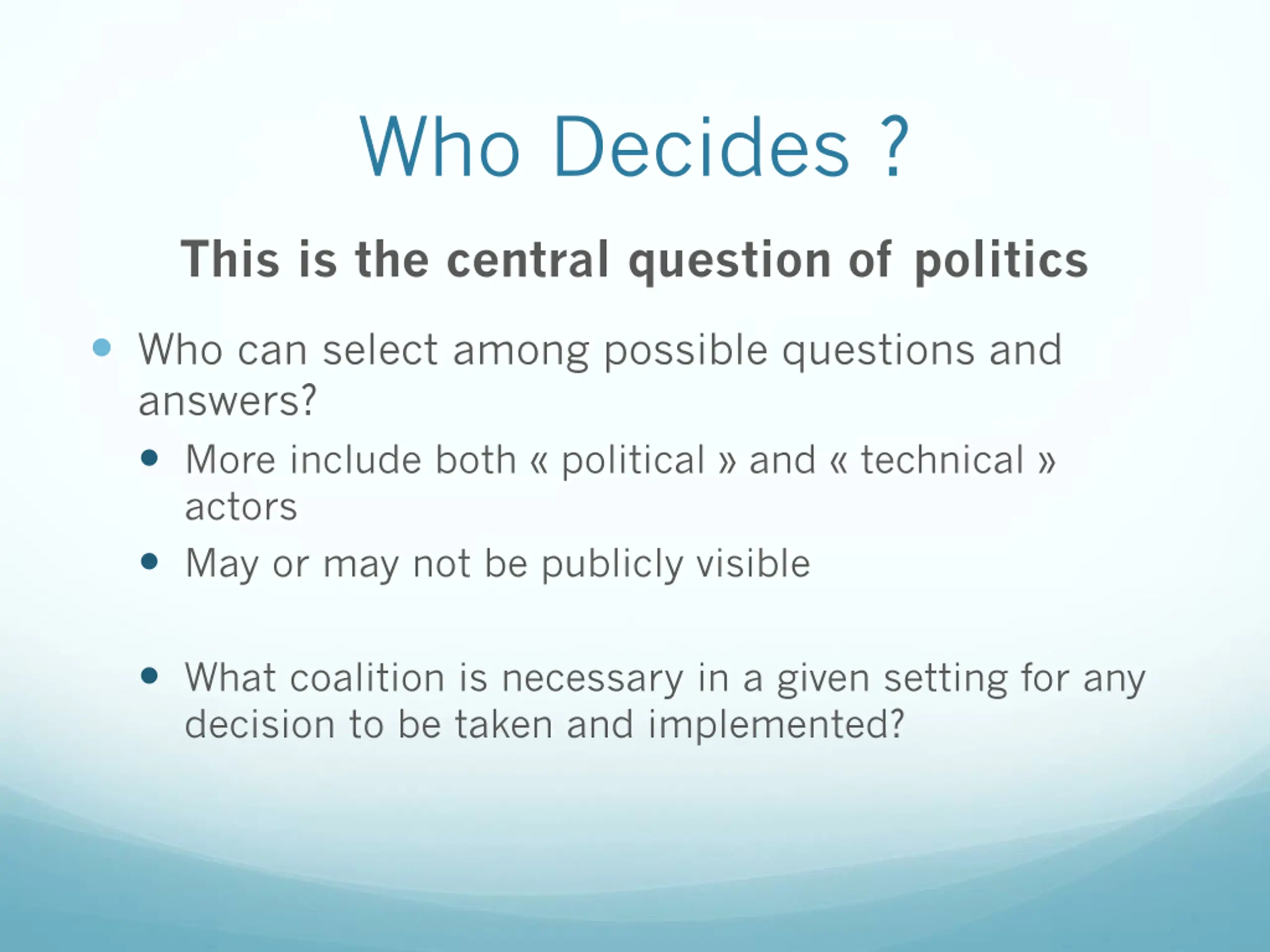 Who Decides ? This is the central question of politics Who can select among possible questions and answers? More include both political and technical actors May or may not be publicly visible What coalition is necessary in a given setting for any decision to be taken and implemented?