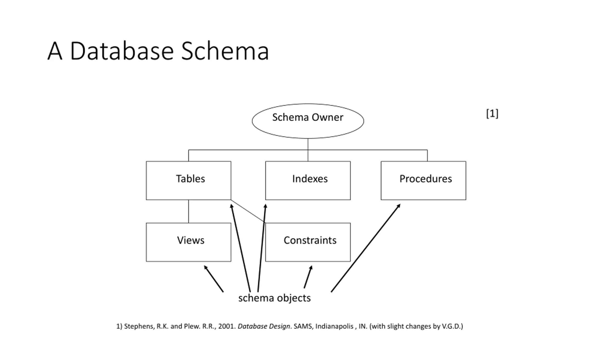- A Database Schema [1] Schema Owner Tables Indexes Procedures Views Constraints schema objects 1) Stephens, R.K. and Plew. R.R., 2001. Database Design. SAMS, Indianapolis , IN. (with slight changes by V.G.D.)
