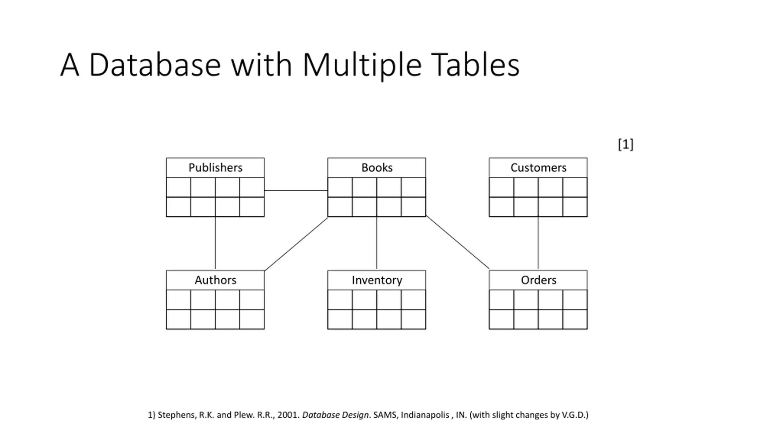 - A Database with Multiple Tables [1] Publishers Books Customers Authors Inventory Orders 1) Stephens, R.K. and Plew. R.R., 2001. Database Design. SAMS, Indianapolis , IN. (with slight changes by V.G.D.)