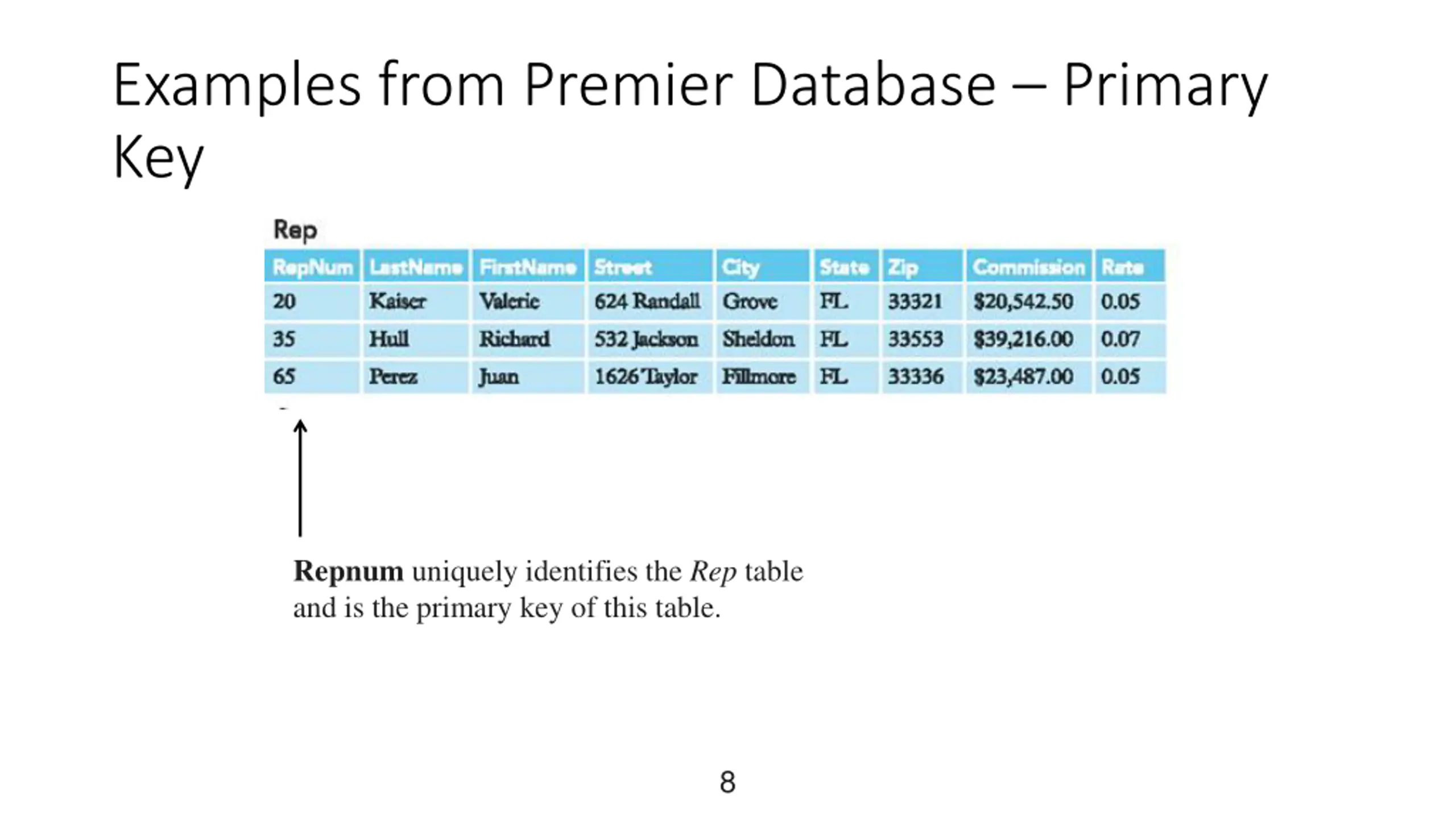 - Examples from Premier Database Primary Key Repnum uniquely identifies the Rep table and is the primary key of this table. 8