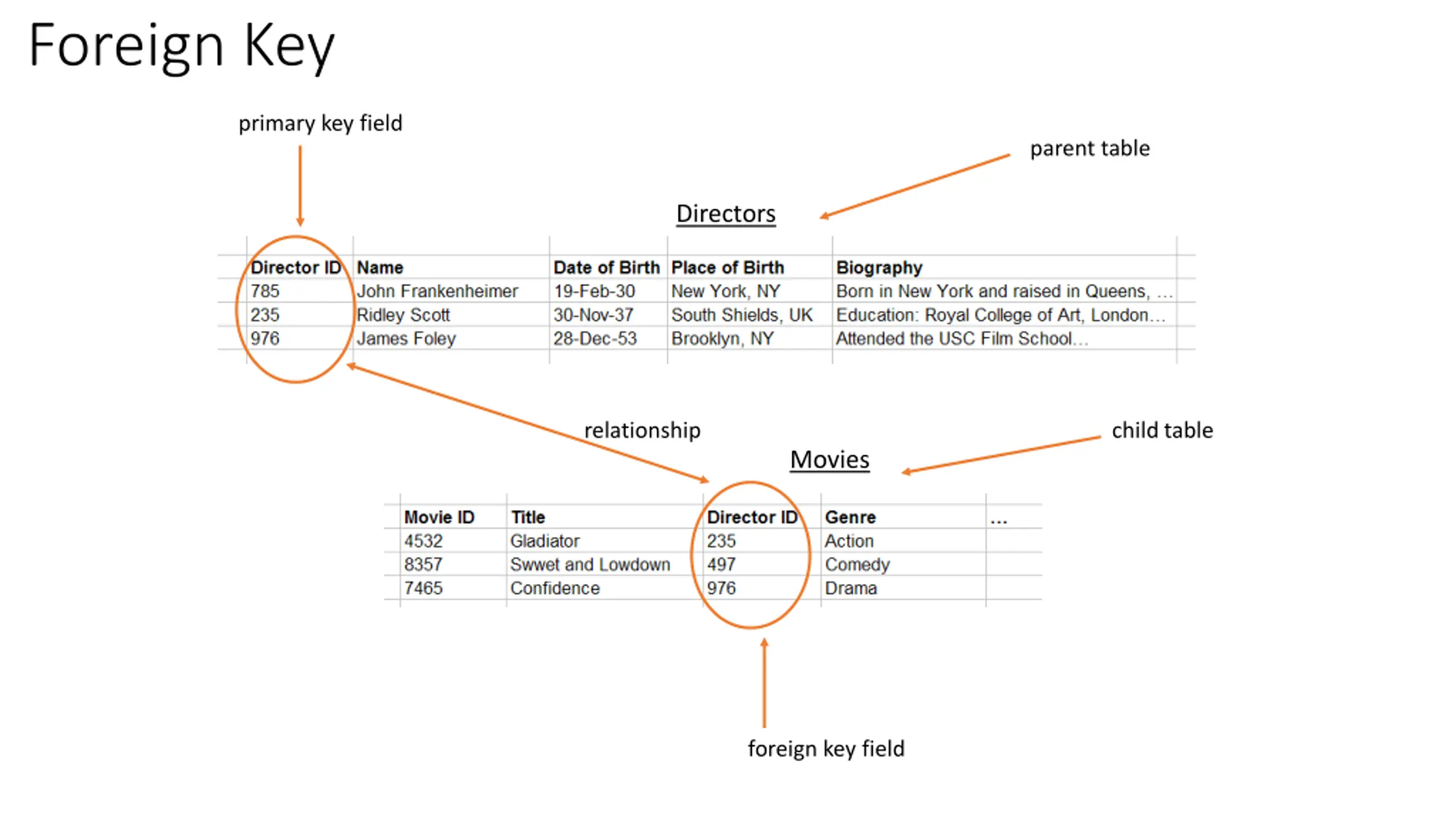 - Foreign Key primary key field parent table Directors relationship child table Movies foreign key field