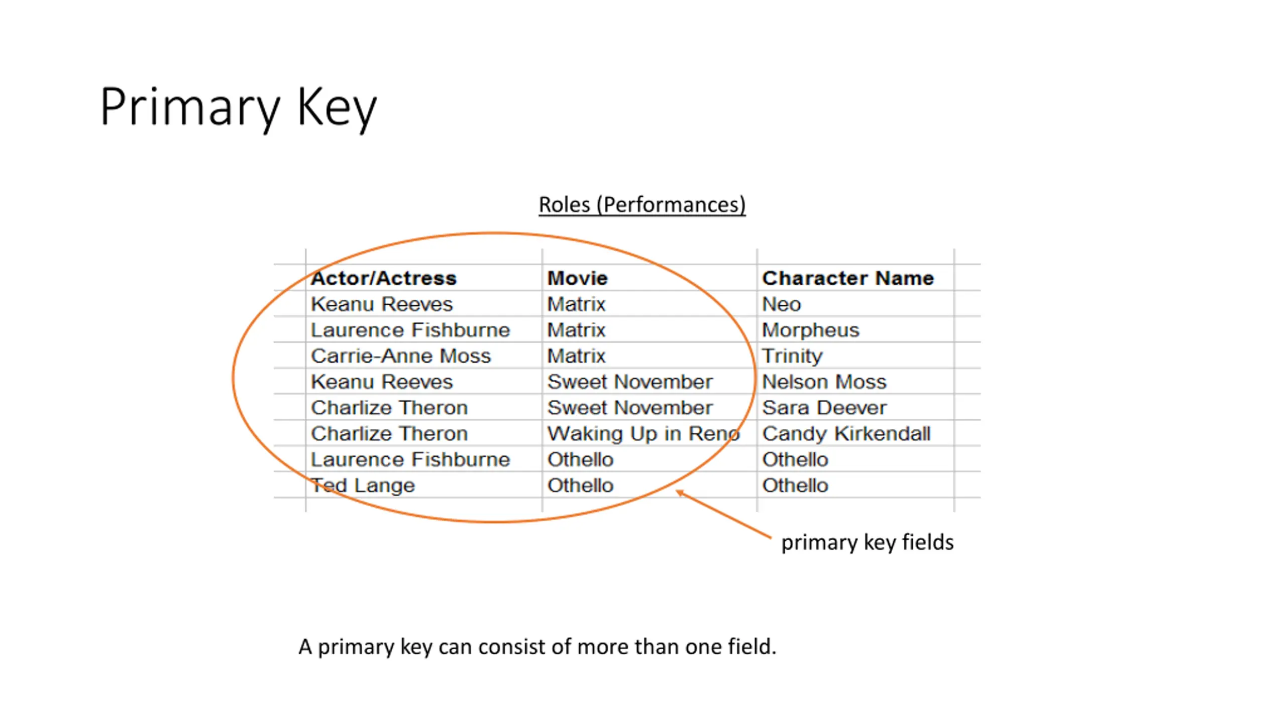 - Primary Key Roles (Performances) primary key fields A primary key can consist of more than one field.