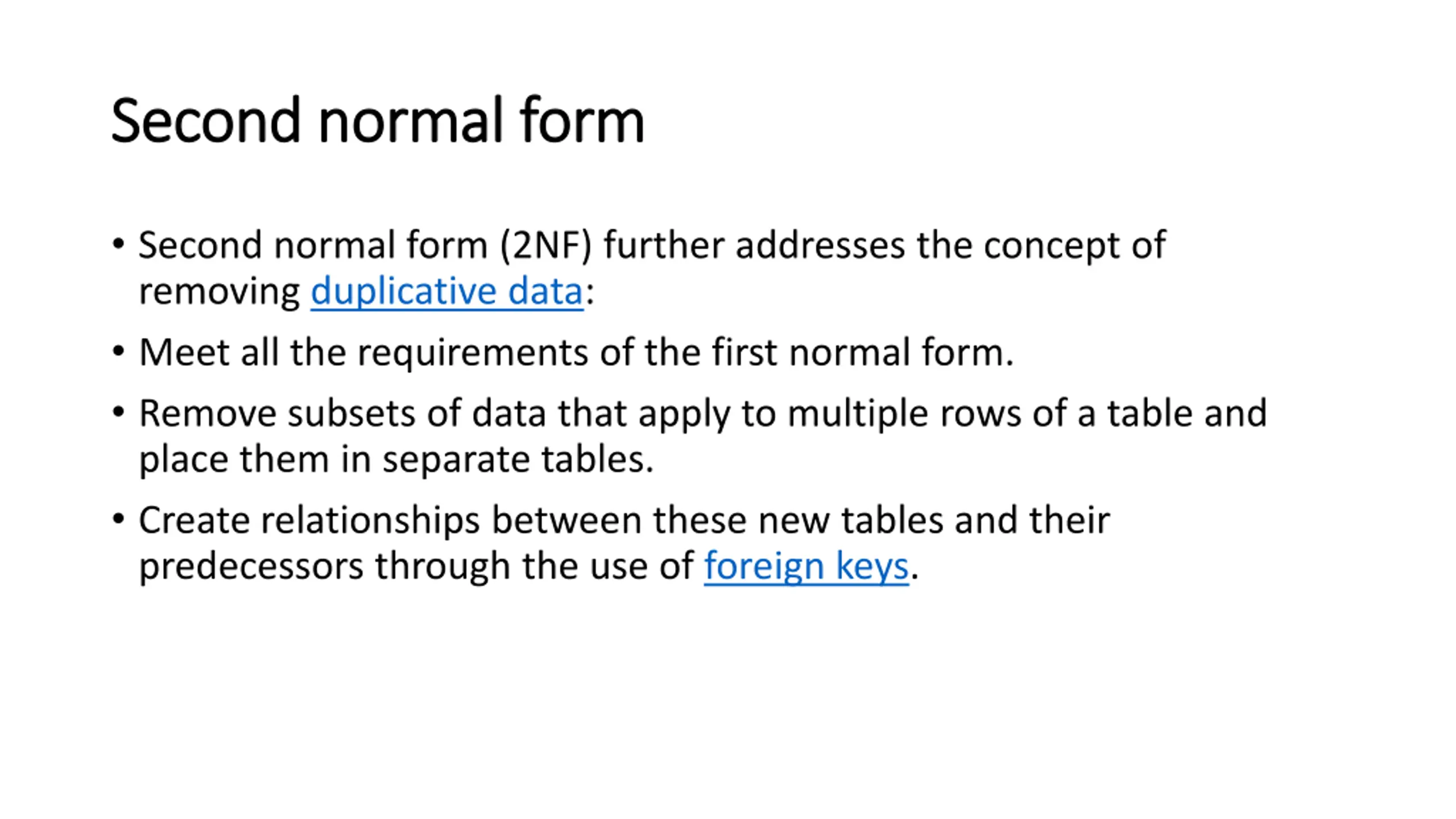 - Second normal form Second normal form Second normal form (2NF) further addresses the concept of removing duplicative data: Meet all the requirements of the first normal form. Remove subsets of data that apply to multiple rows of a table and place them in separate tables. Create relationships between these new tables and their predecessors through the use of foreign keys.