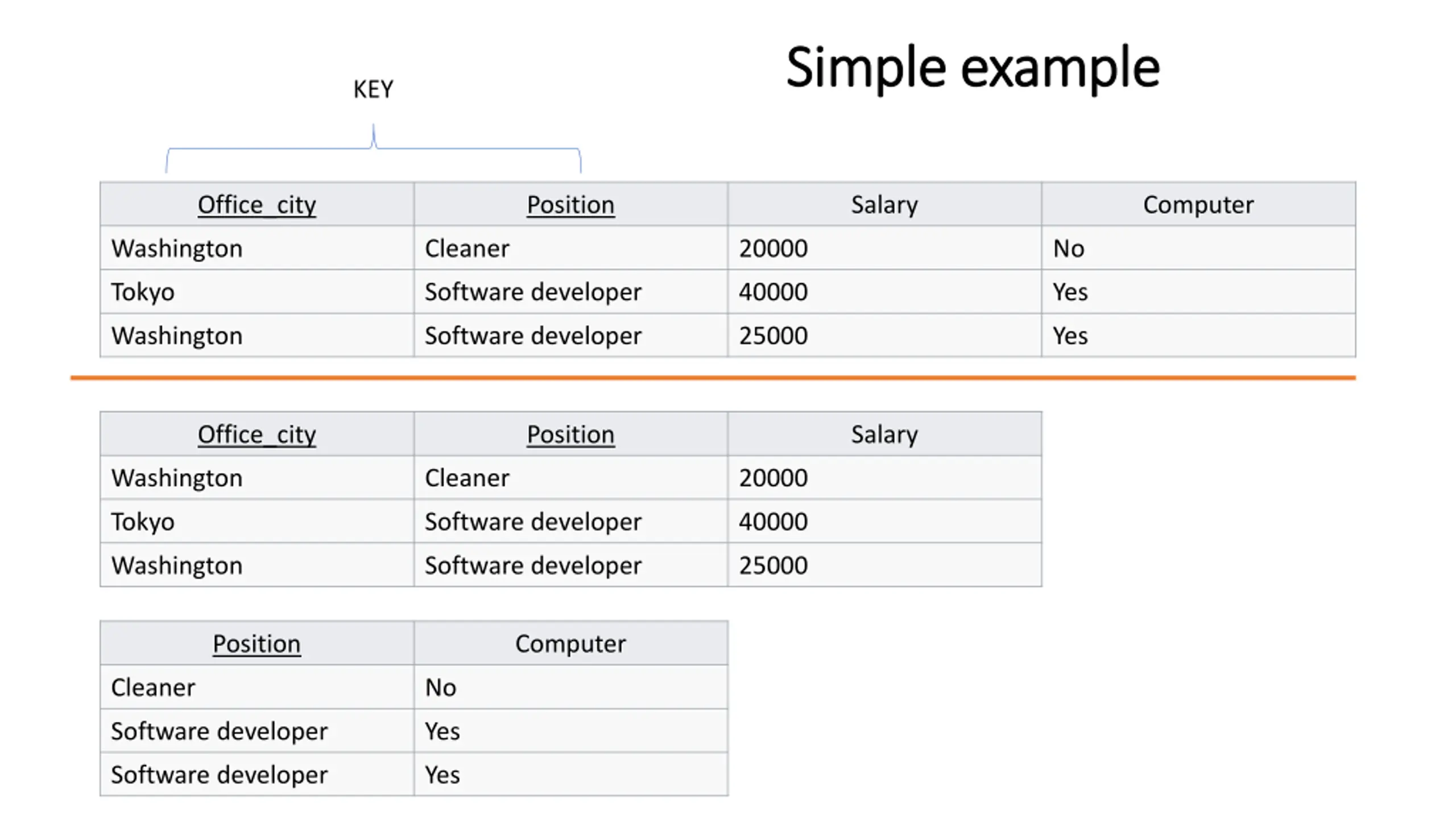 - Simple example Simple example KEY Office_city Position Salary Computer Washington Cleaner 20000 No Tokyo Software developer 40000 Yes Washington Software developer 25000 Yes Office_city Position Salary Washington Cleaner 20000 Tokyo Software developer 40000 Washington Software developer 25000 Position Computer Cleaner No Software developer Yes Software developer Yes
