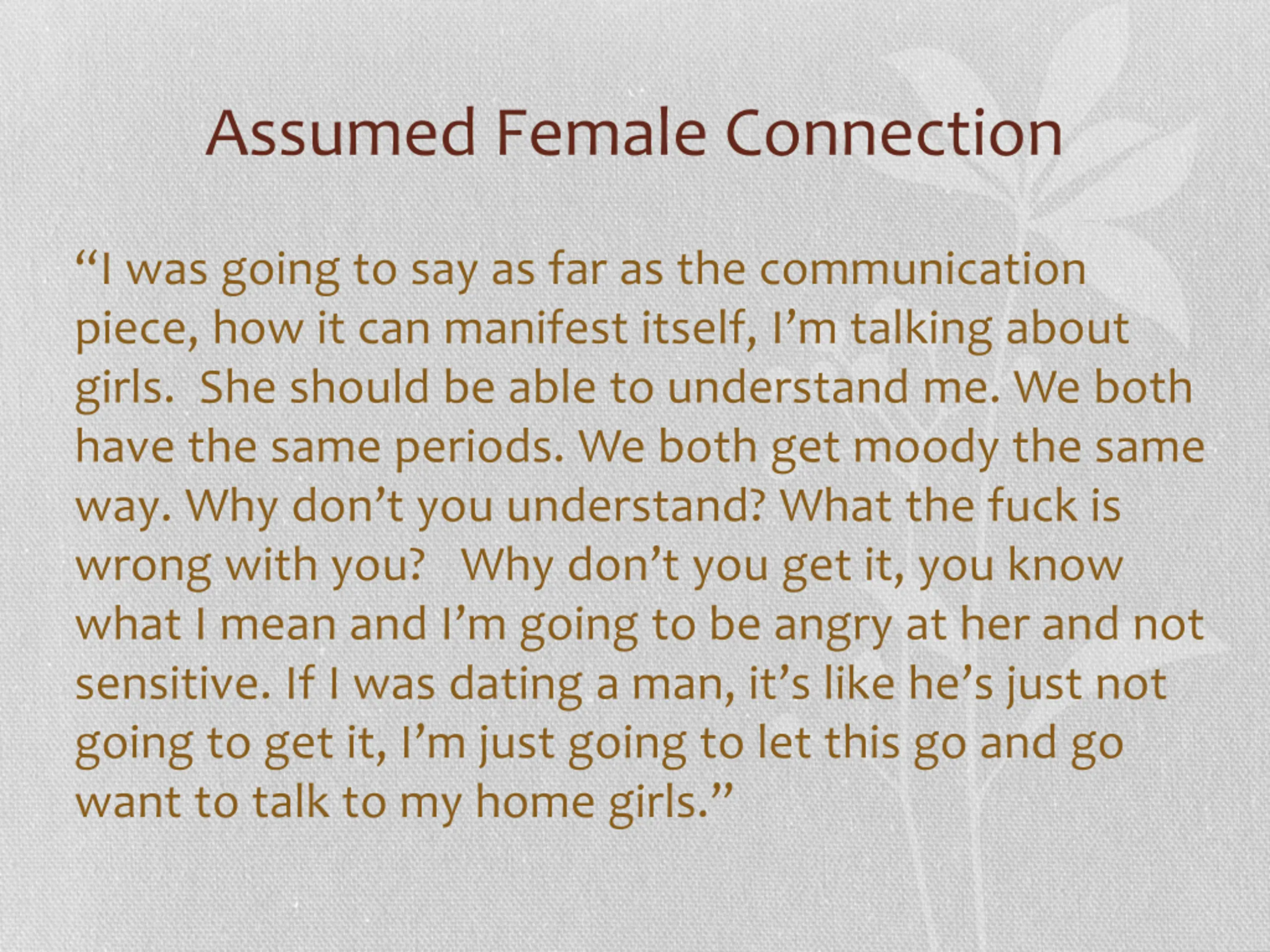 Assumed Female Connection I was going to say as far as the communication piece, how it can manifest itself, I m talking about girls. She should be able to understand me. We both have the same periods. We both get moody the same way. Why don t you understand? What the fuck is wrong with you? Why don t you get it, you know what I mean and I m going to be angry at her and not sensitive. If I was dating a man, it s like he s just not going to get it, I m just going to let this go and go want to talk to my home girls.