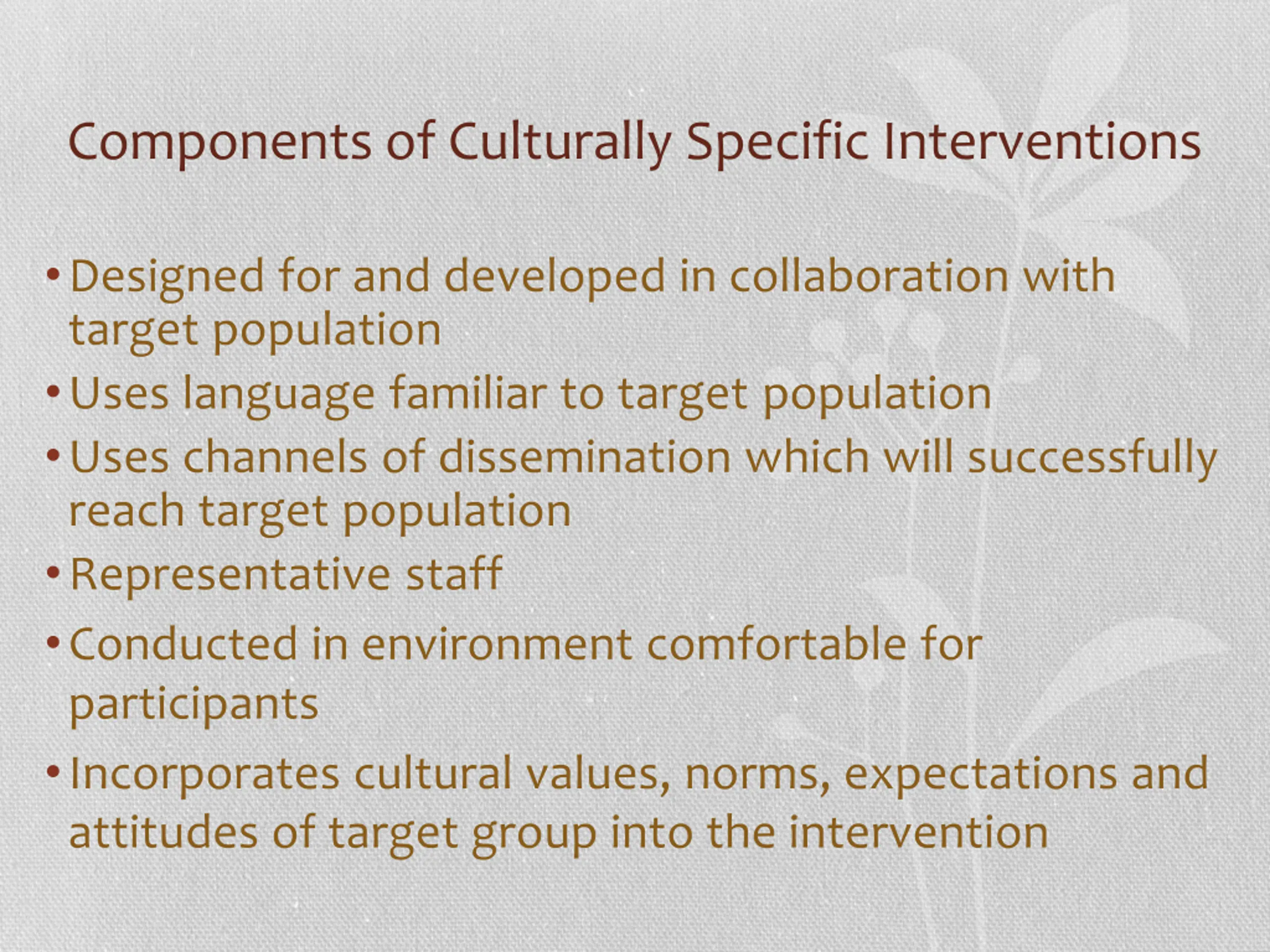 Components of Culturally Specific Interventions Designed for and developed in collaboration with target population Uses language familiar to target population Uses channels of dissemination which will successfully reach target population Representative staff Conducted in environment comfortable for participants Incorporates cultural values, norms, expectations and attitudes of target group into the intervention