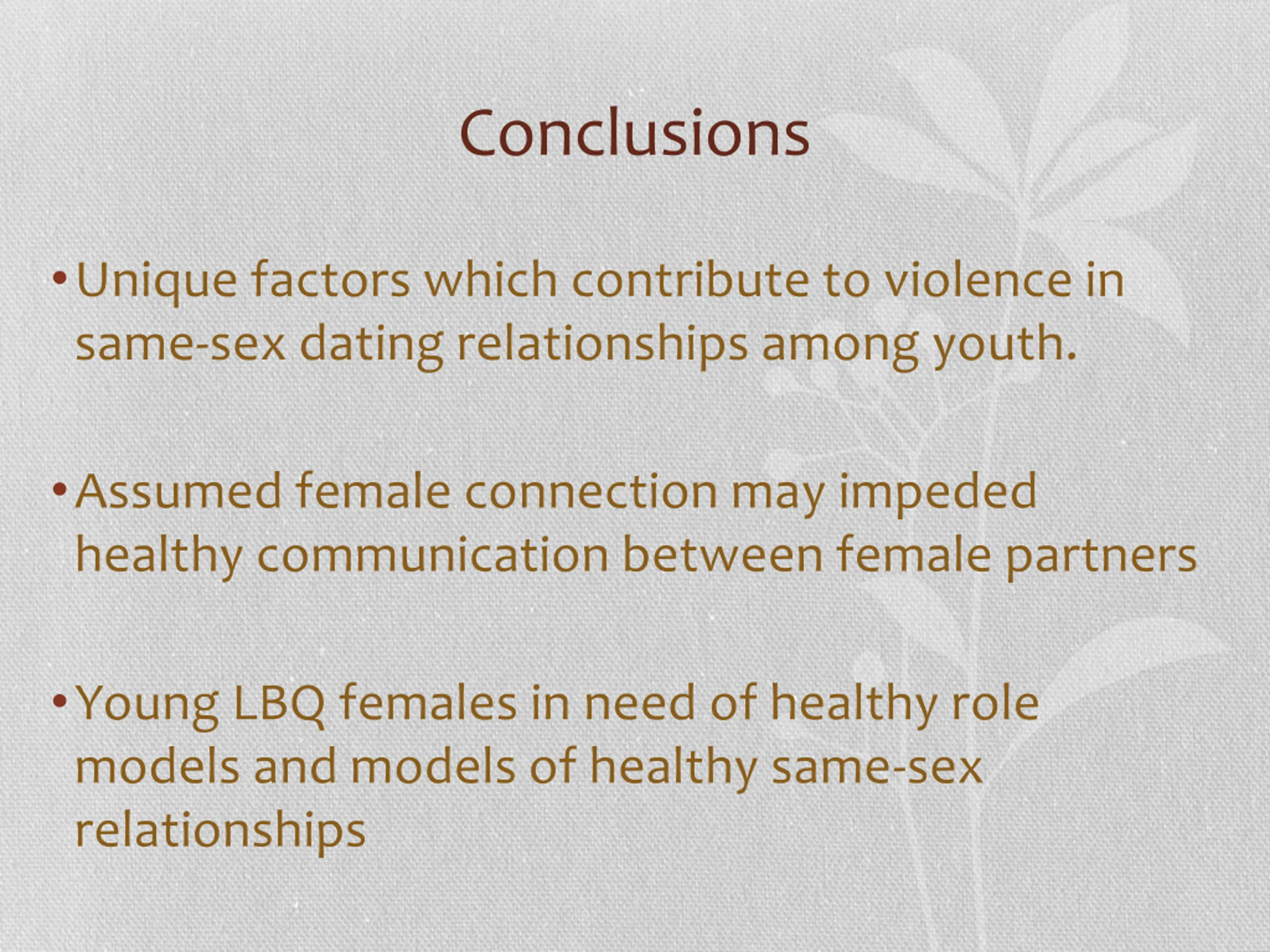 Conclusions Unique factors which contribute to violence in same-sex dating relationships among youth. Assumed female connection may impeded healthy communication between female partners Young LBQ females in need of healthy role models and models of healthy same-sex relationships