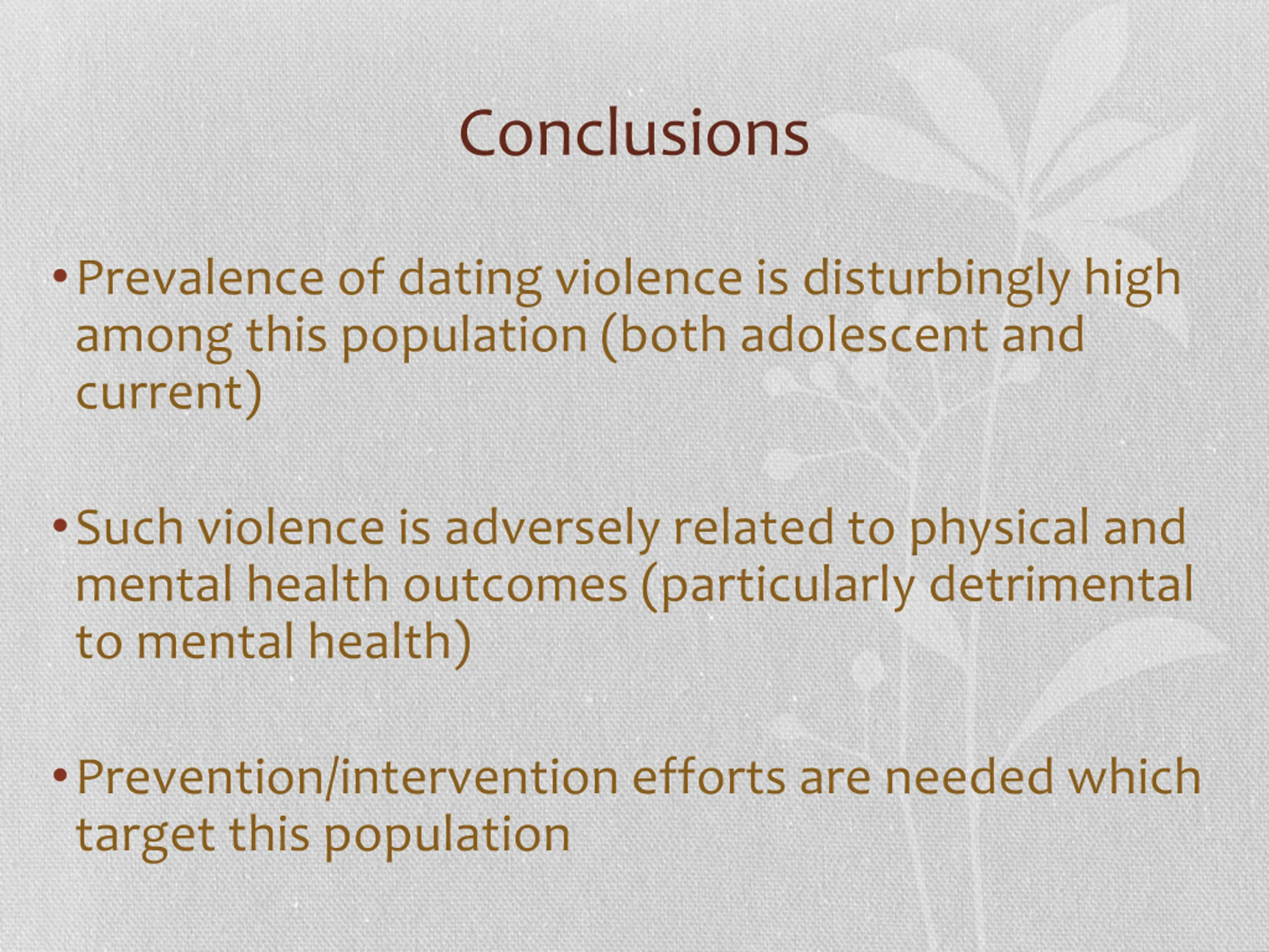 Conclusions Prevalence of dating violence is disturbingly high among this population (both adolescent and current) Such violence is adversely related to physical and mental health outcomes (particularly detrimental to mental health) Prevention/intervention efforts are needed which target this population