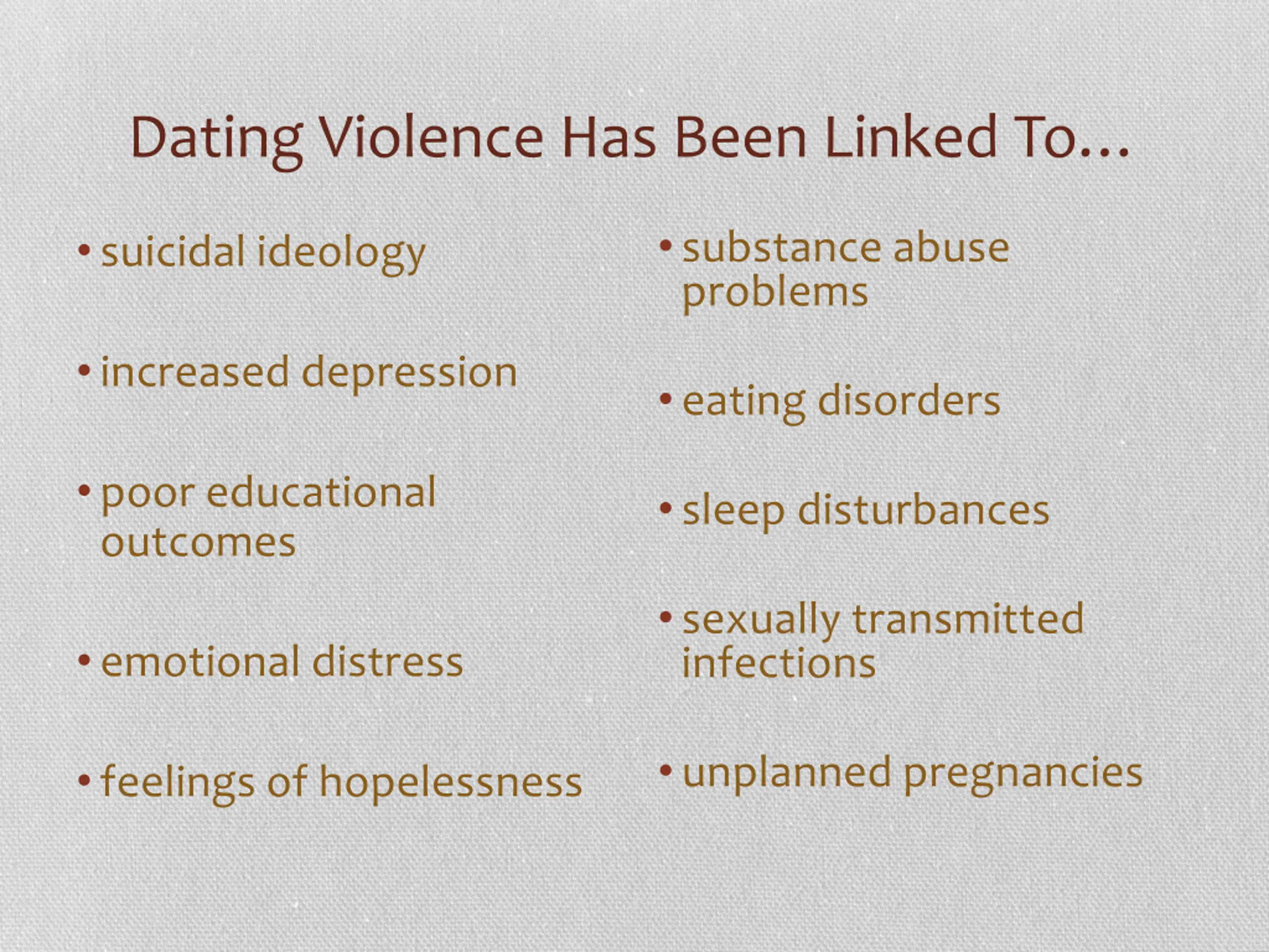 Dating Violence Has Been Linked To substance abuse problems suicidal ideology increased depression eating disorders poor educational outcomes sleep disturbances sexually transmitted infections emotional distress unplanned pregnancies feelings of hopelessness
