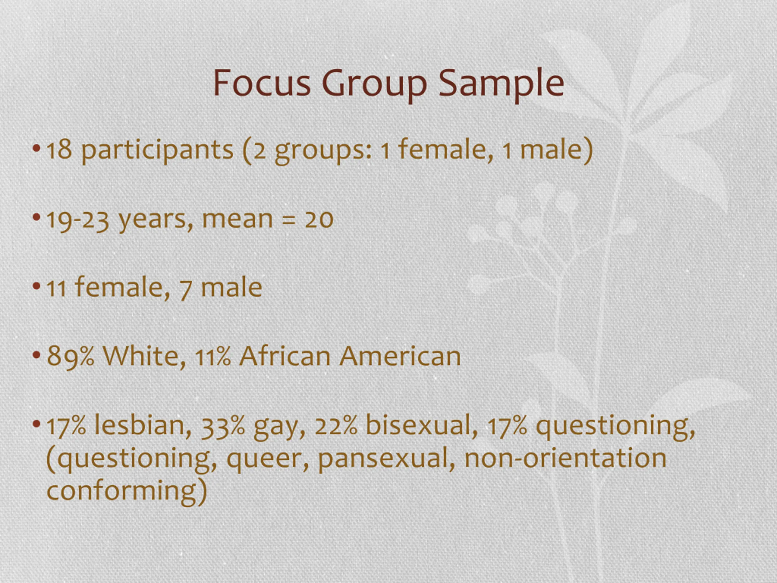 Focus Group Sample 18 participants (2 groups: 1 female, 1 male) 19-23 years, mean = 20 11 female, 7 male 89% White, 11% African American 17% lesbian, 33% gay, 22% bisexual, 17% questioning, (questioning, queer, pansexual, non-orientation conforming)