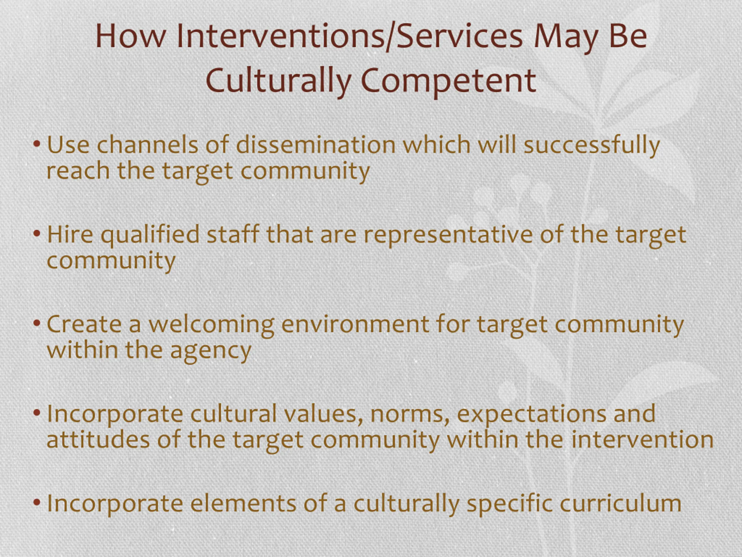 How Interventions/Services May Be Culturally Competent Use channels of dissemination which will successfully reach the target community Hire qualified staff that are representative of the target community Create a welcoming environment for target community within the agency Incorporate cultural values, norms, expectations and attitudes of the target community within the intervention Incorporate elements of a culturally specific curriculum