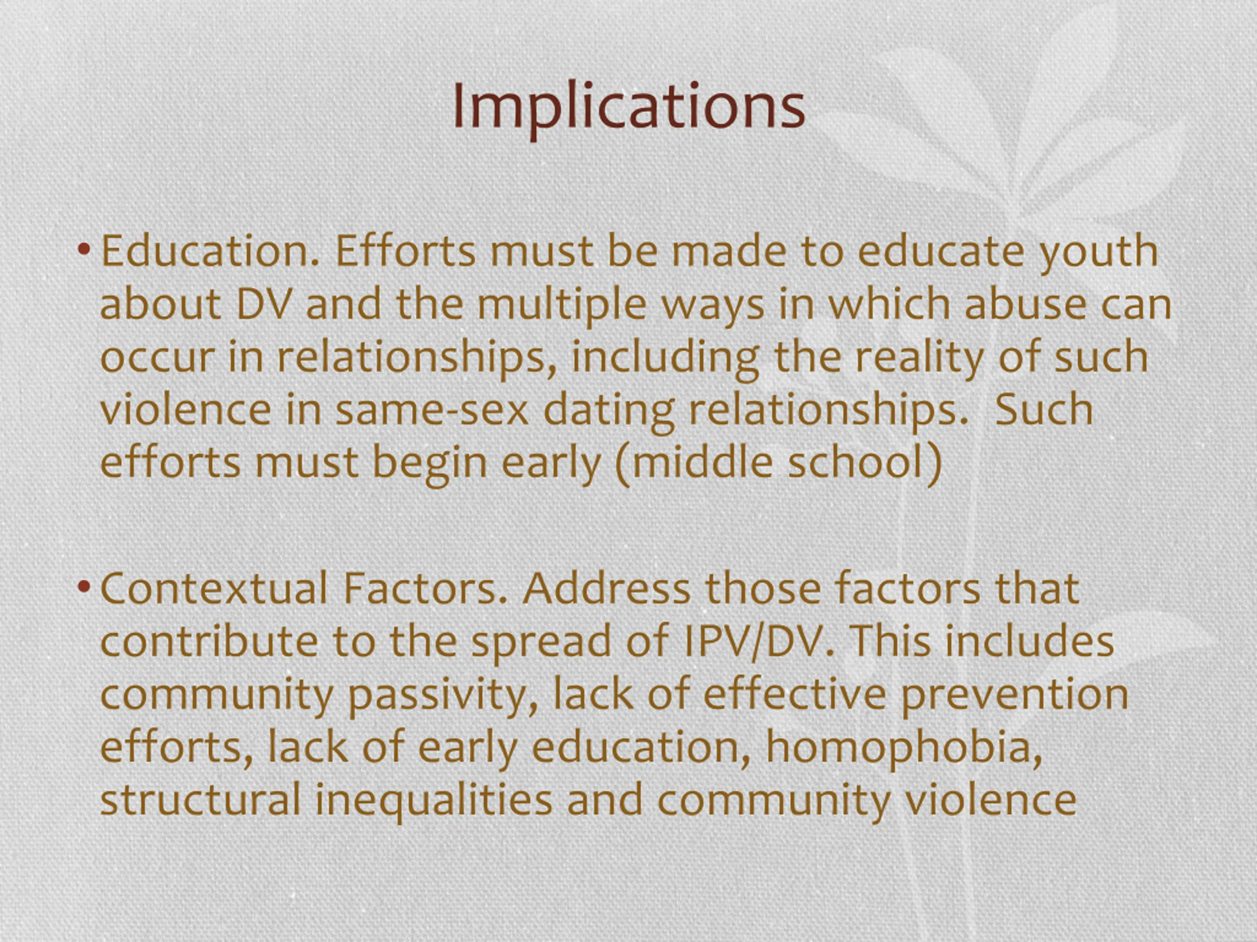 Implications Education. Efforts must be made to educate youth about DV and the multiple ways in which abuse can occur in relationships, including the reality of such violence in same-sex dating relationships. Such efforts must begin early (middle school) Contextual Factors. Address those factors that contribute to the spread of IPV/DV. This includes community passivity, lack of effective prevention efforts, lack of early education, homophobia, structural inequalities and community violence
