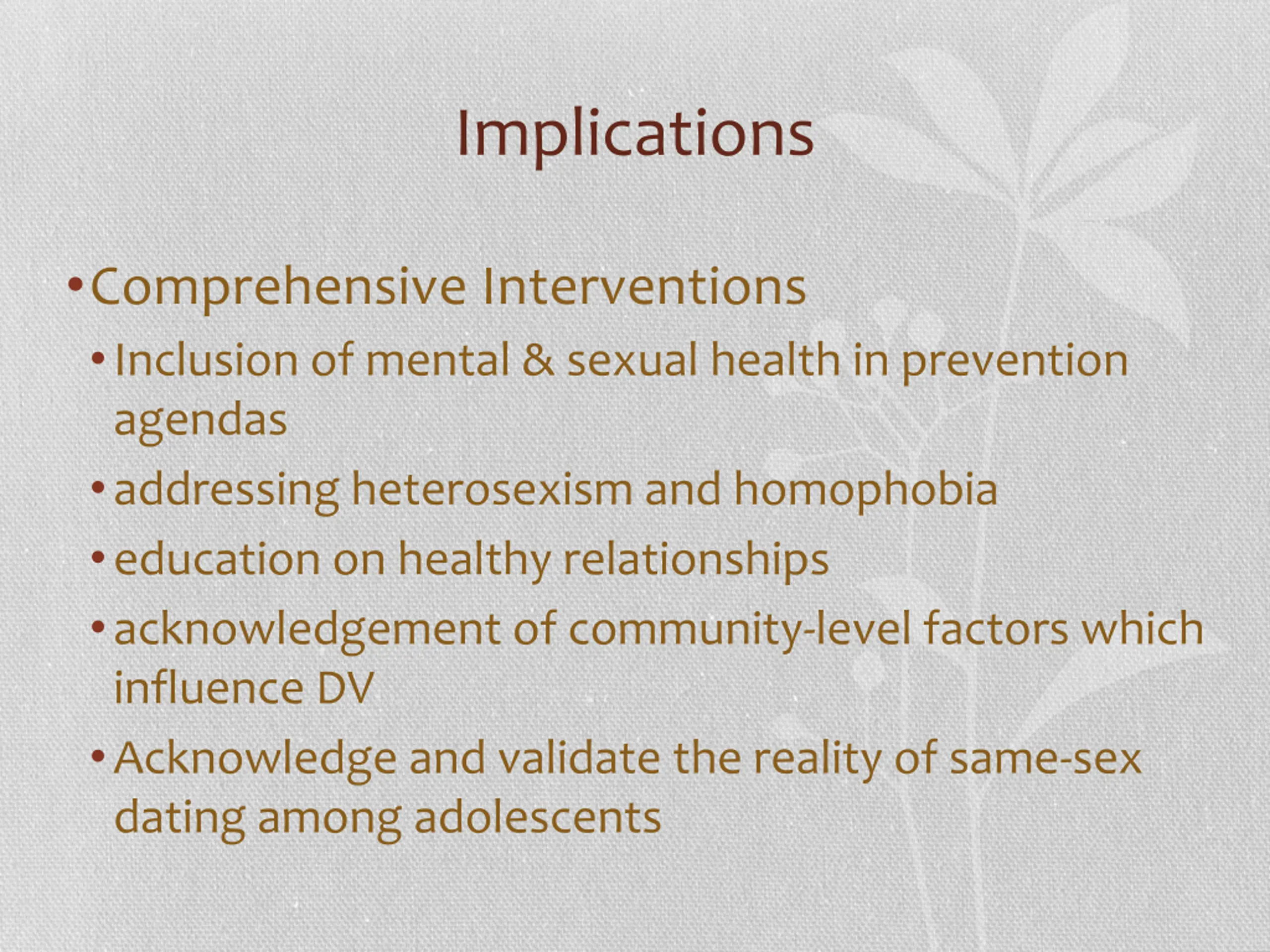 Implications Comprehensive Interventions Inclusion of mental & sexual health in prevention agendas addressing heterosexism and homophobia education on healthy relationships acknowledgement of community-level factors which influence DV Acknowledge and validate the reality of same-sex dating among adolescents