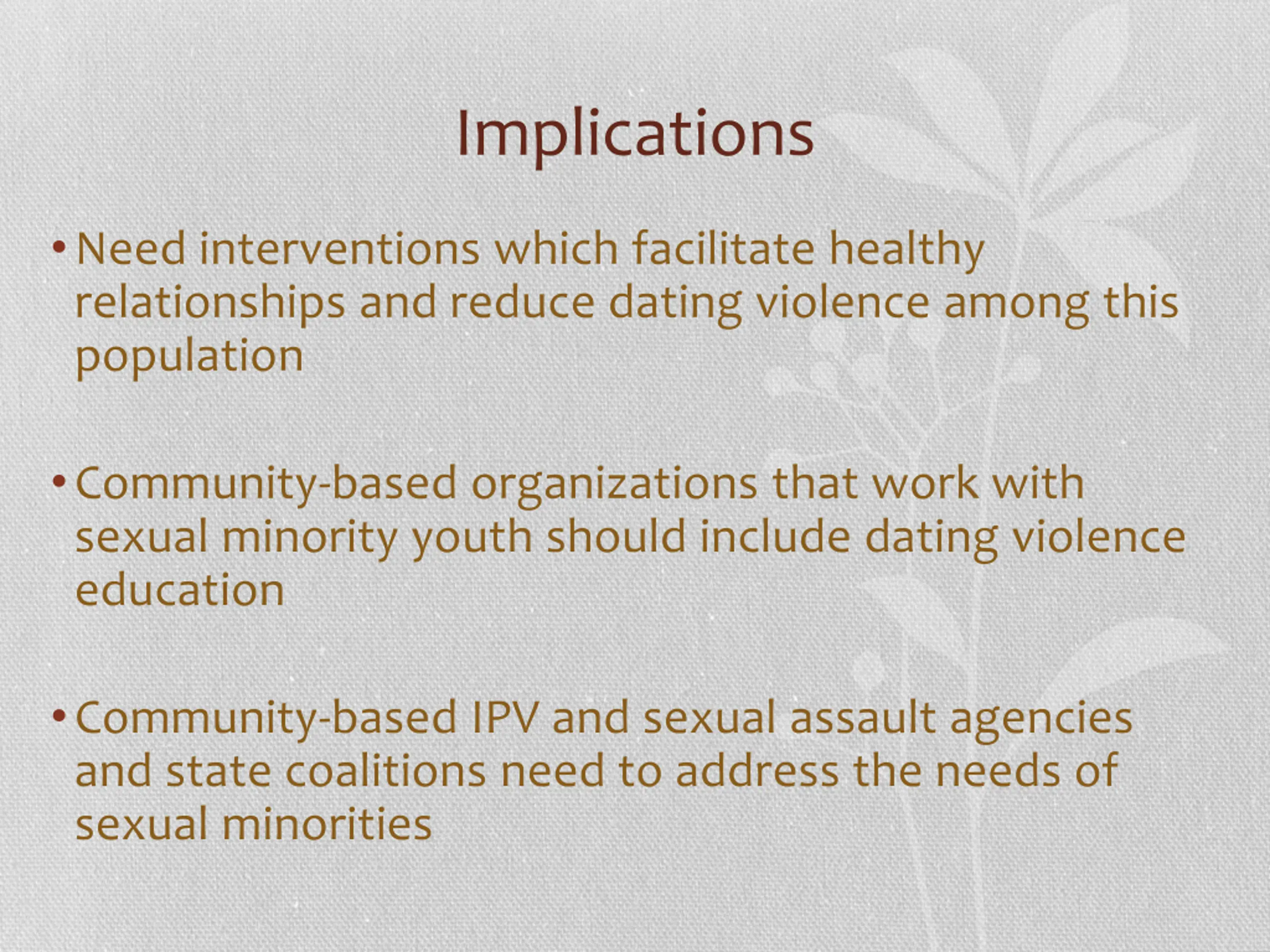 Implications Need interventions which facilitate healthy relationships and reduce dating violence among this population Community-based organizations that work with sexual minority youth should include dating violence education Community-based IPV and sexual assault agencies and state coalitions need to address the needs of sexual minorities