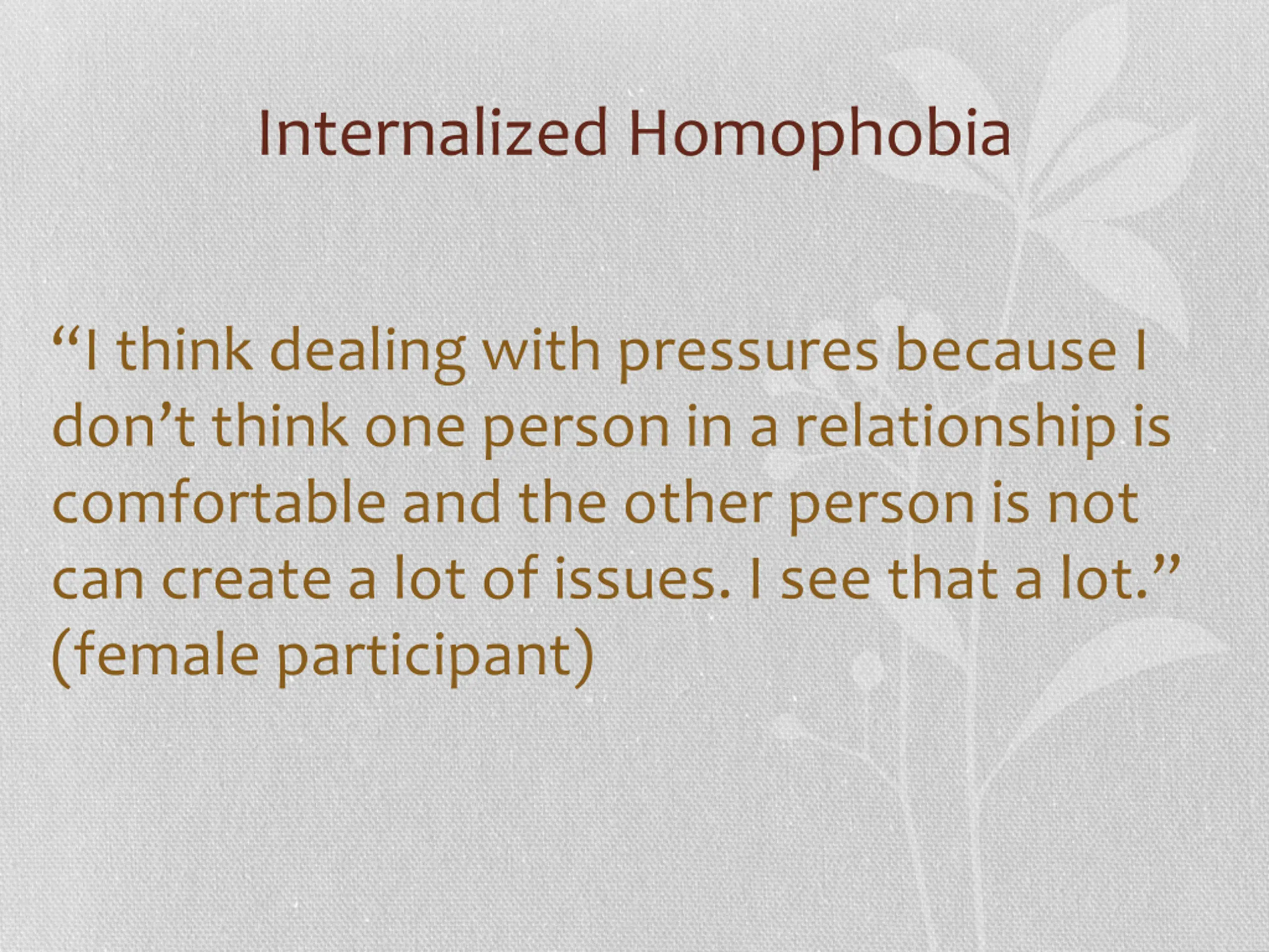 Internalized Homophobia I think dealing with pressures because I don t think one person in a relationship is comfortable and the other person is not can create a lot of issues. I see that a lot. (female participant)