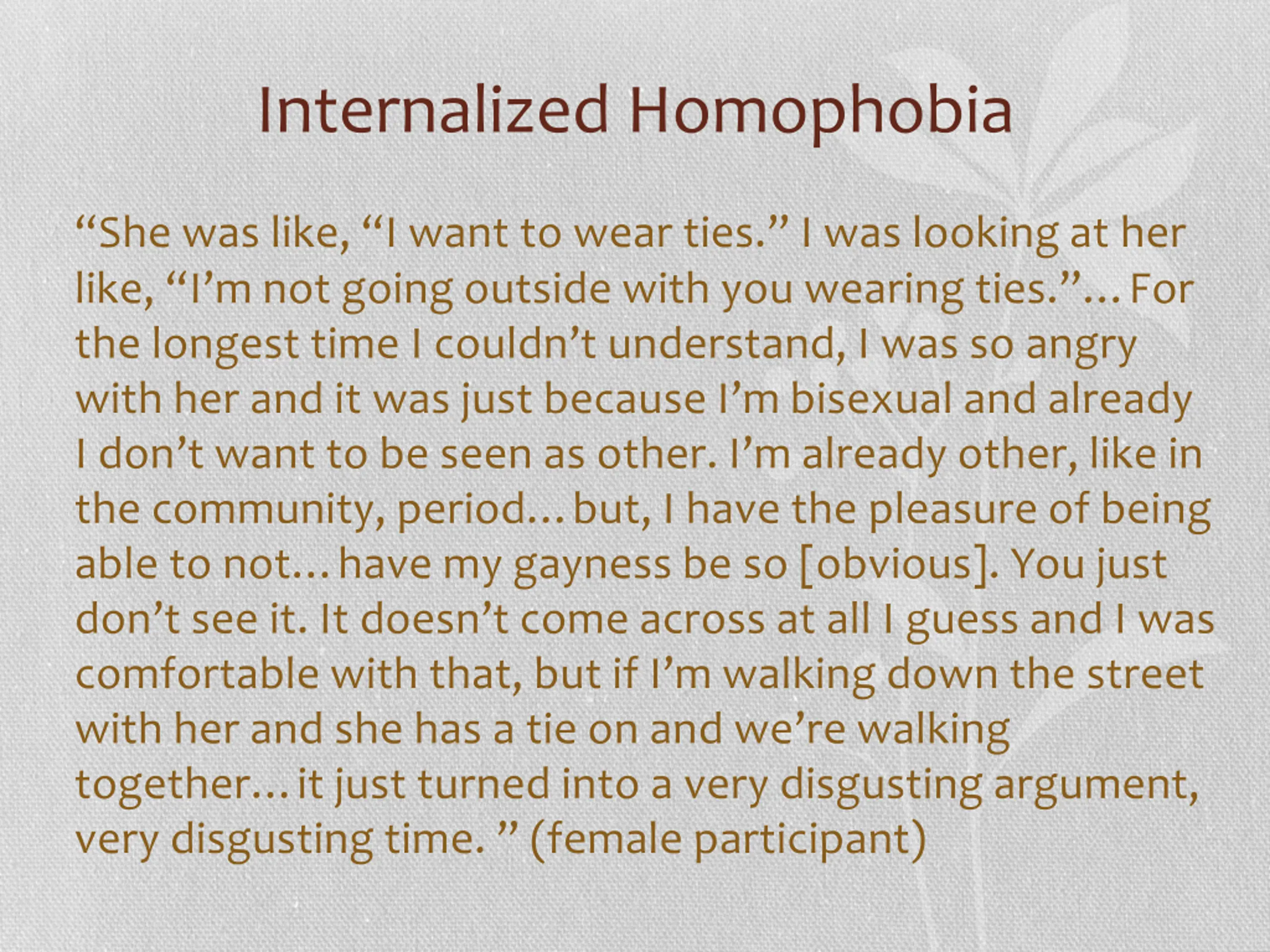 Internalized Homophobia She was like, I want to wear ties. I was looking at her like, I m not going outside with you wearing ties. For the longest time I couldn t understand, I was so angry with her and it was just because I m bisexual and already I don t want to be seen as other. I m already other, like in the community, period but, I have the pleasure of being able to not have my gayness be so [obvious]. You just don t see it. It doesn t come across at all I guess and I was comfortable with that, but if I m walking down the street with her and she has a tie on and we re walking together it just turned into a very disgusting argument, very disgusting time. (female participant)