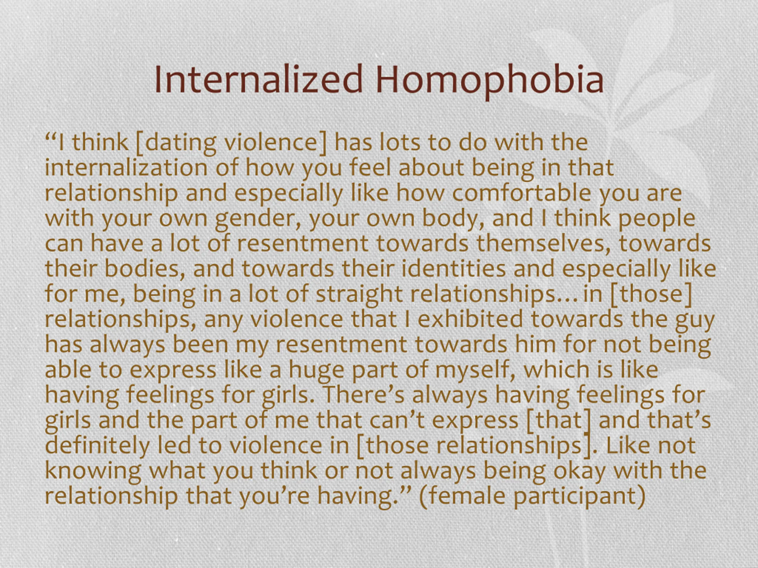 Internalized Homophobia I think [dating violence] has lots to do with the internalization of how you feel about being in that relationship and especially like how comfortable you are with your own gender, your own body, and I think people can have a lot of resentment towards themselves, towards their bodies, and towards their identities and especially like for me, being in a lot of straight relationships in [those] relationships, any violence that I exhibited towards the guy has always been my resentment towards him for not being able to express like a huge part of myself, which is like having feelings for girls. There s always having feelings for girls and the part of me that can t express [that] and that s definitely led to violence in [those relationships]. Like not knowing what you think or not always being okay with the relationship that you re having. (female participant)