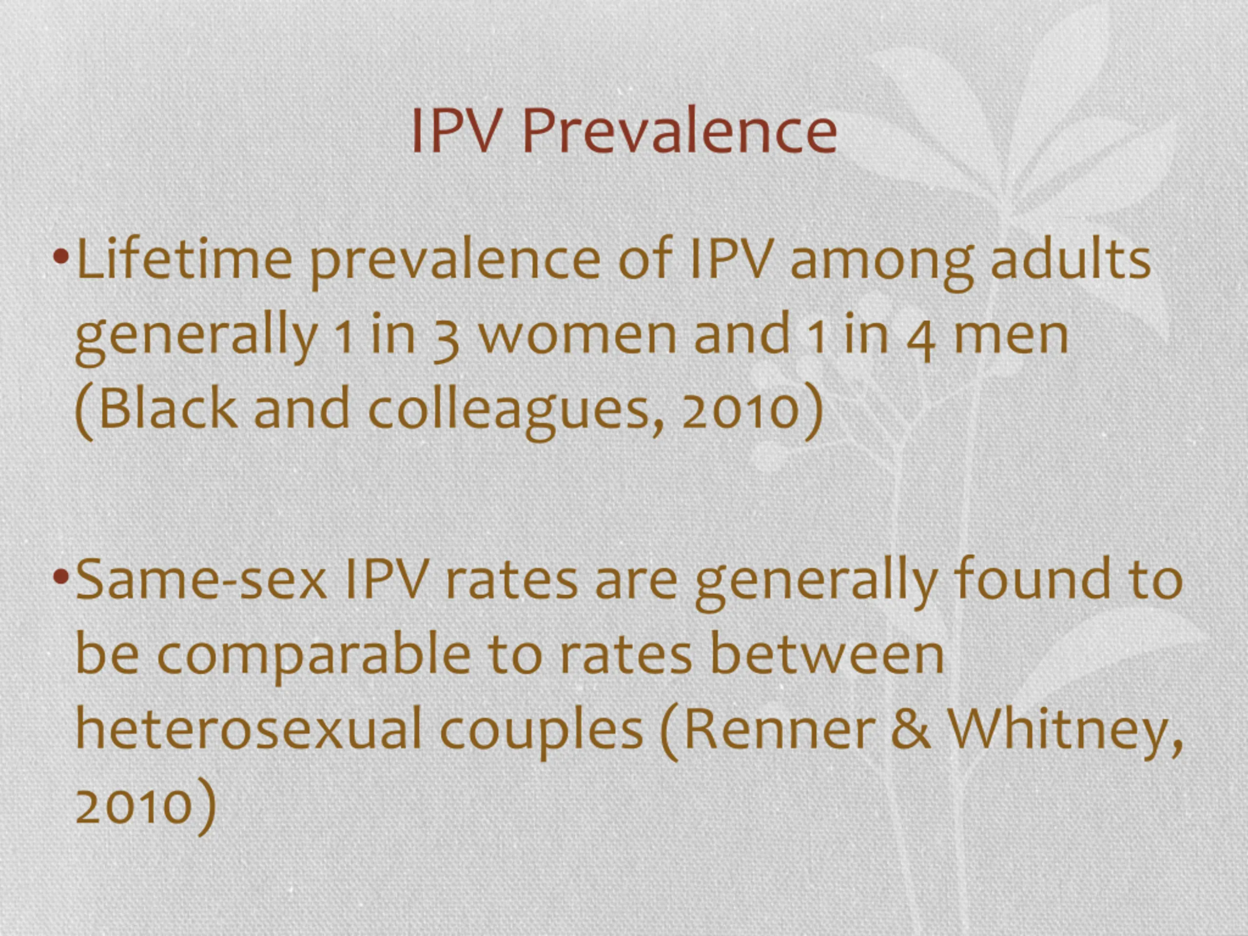 IPV Prevalence Lifetime prevalence of IPV among adults generally 1 in 3 women and 1 in 4 men (Black and colleagues, 2010) Same-sex IPV rates are generally found to be comparable to rates between heterosexual couples (Renner & Whitney, 2010)